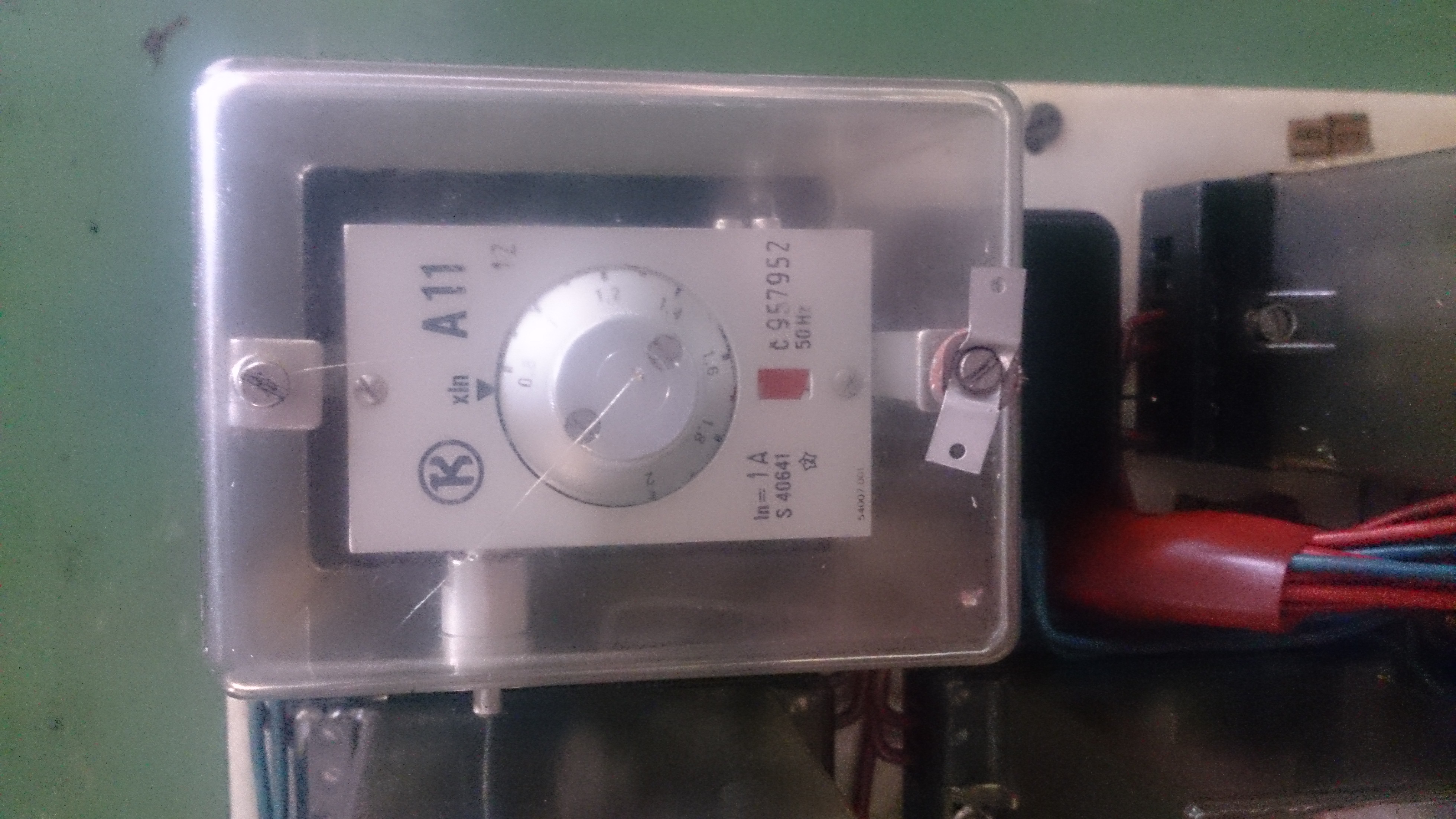 Ta krabka s terčíkem je nadproudové relé (ochrana) no a pokud to nejde odmáčknout (aby to červený nebylo vidět a musí zůstat schovaný), tak je něco špatně-to relé je tam velmi pravděpodobne kvůli tomu elektromagnetu, aby se nepřetížil.
