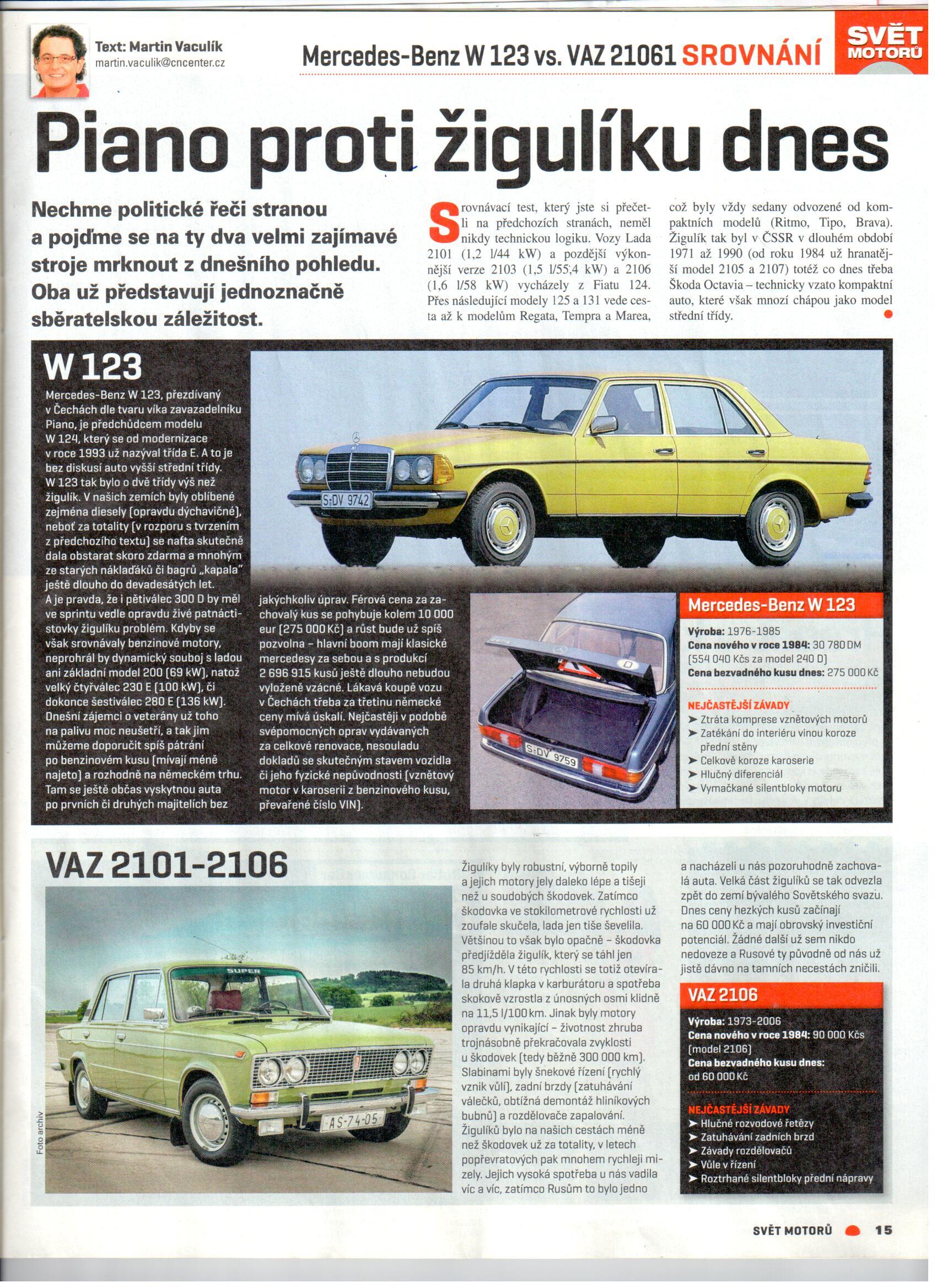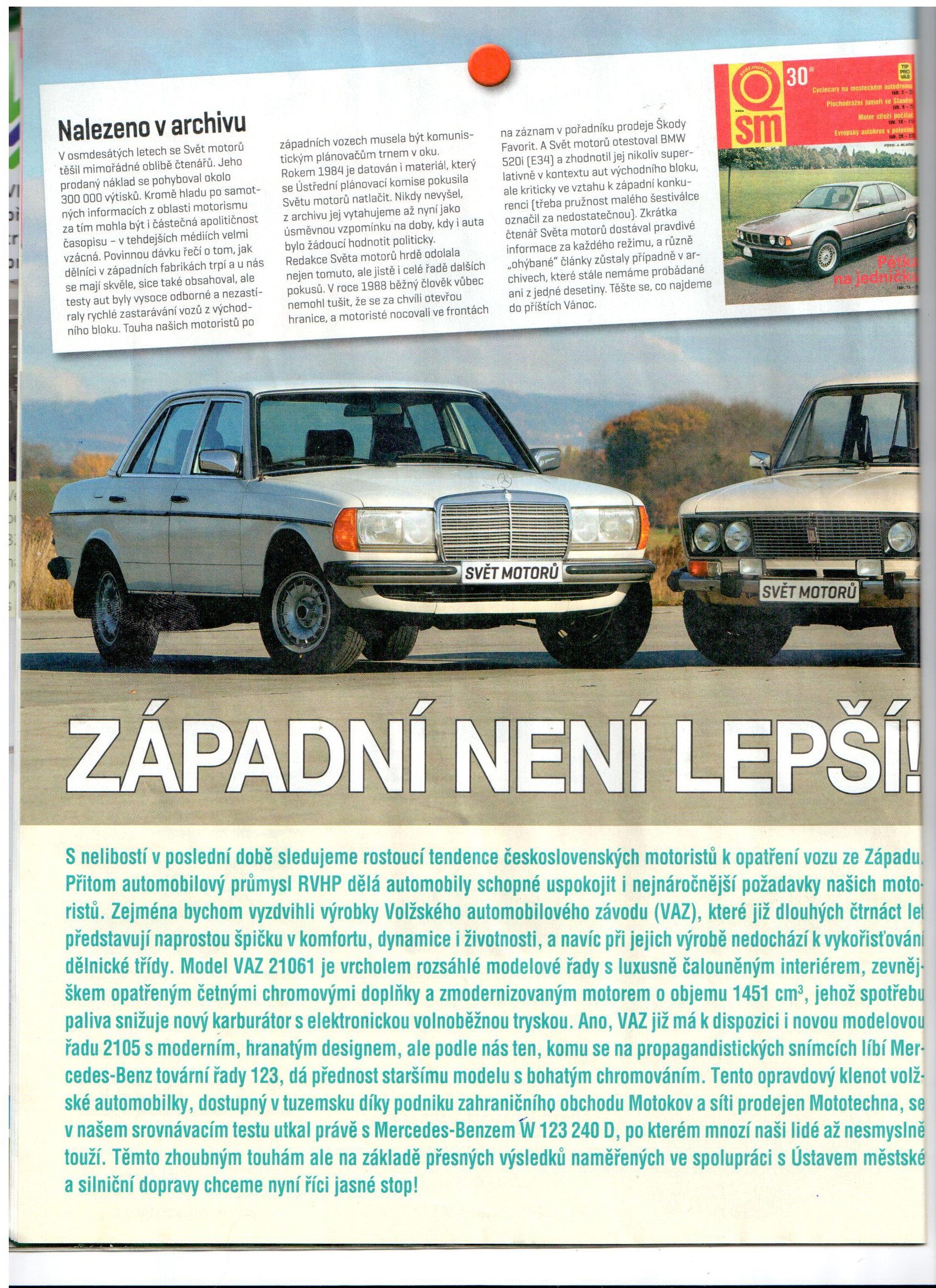 scan článku ze Světa motorů č. 51/2016 o srovnání Žigulíka a MB W123 (piano) připravovaného do tisku ve Světě motorů v r. 1984