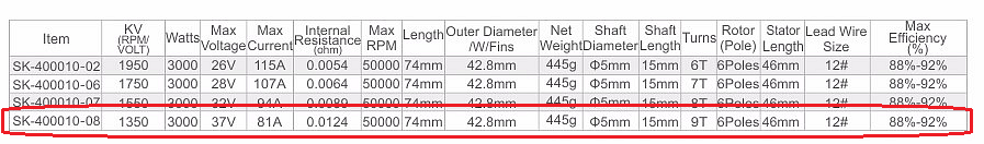 Další věc je že hodnoty výkonů těm modelářských motorů jsou z říše snů. Vždy výrobci uvádějí příkon ( tedy ne výkon) a vždy je to pro nějakou relativně krátkou dobu. Takže těn 3000Kw motor bych viděl tak na 400W reálně. (reálně se dá u 500g motoru počítat s 500W trvalého výkonu při rozumném chlazení a vhodném použití). I když se hodně snažím tak se pohybuju s účiností 85-90%, v některých případech jsem se dostal i na 95% ( což mohla být i chyba měření).