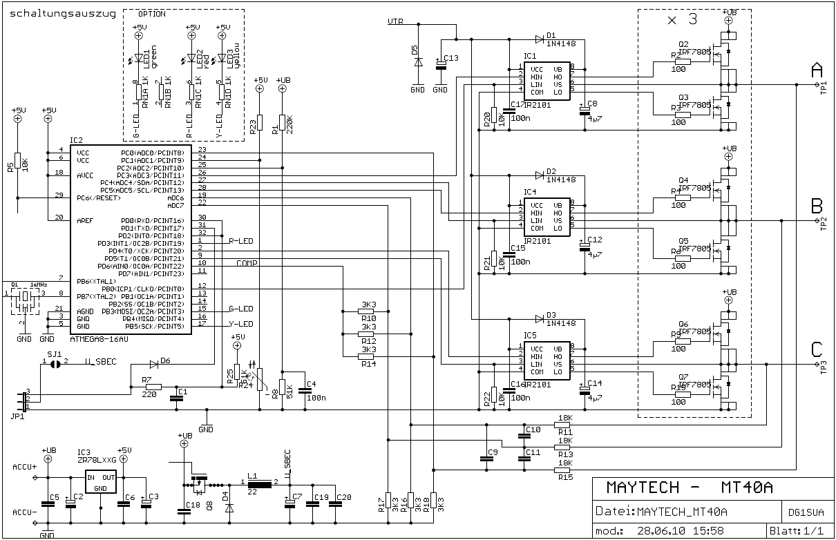 Asi se do stavby pouštět nebudu, zdá se, že u toho může člověk strávit mládí, přesto jsem ještě trochu hledal. Vzpomněl jsem si, že na mých Afro regulátorech zmiňovali nějaký firmware, tak jsem googlil a narazil na dvě repository s open-source firmware pro hardwareově poměrně jednoduché regulátory (pro bezsenzorové motory, skalární řízení) postavené kolem ATmega8, jsou tam i schemata, buzení FETů buď přímé nebo pomocí IR2101, což se dá koupit i v GME..