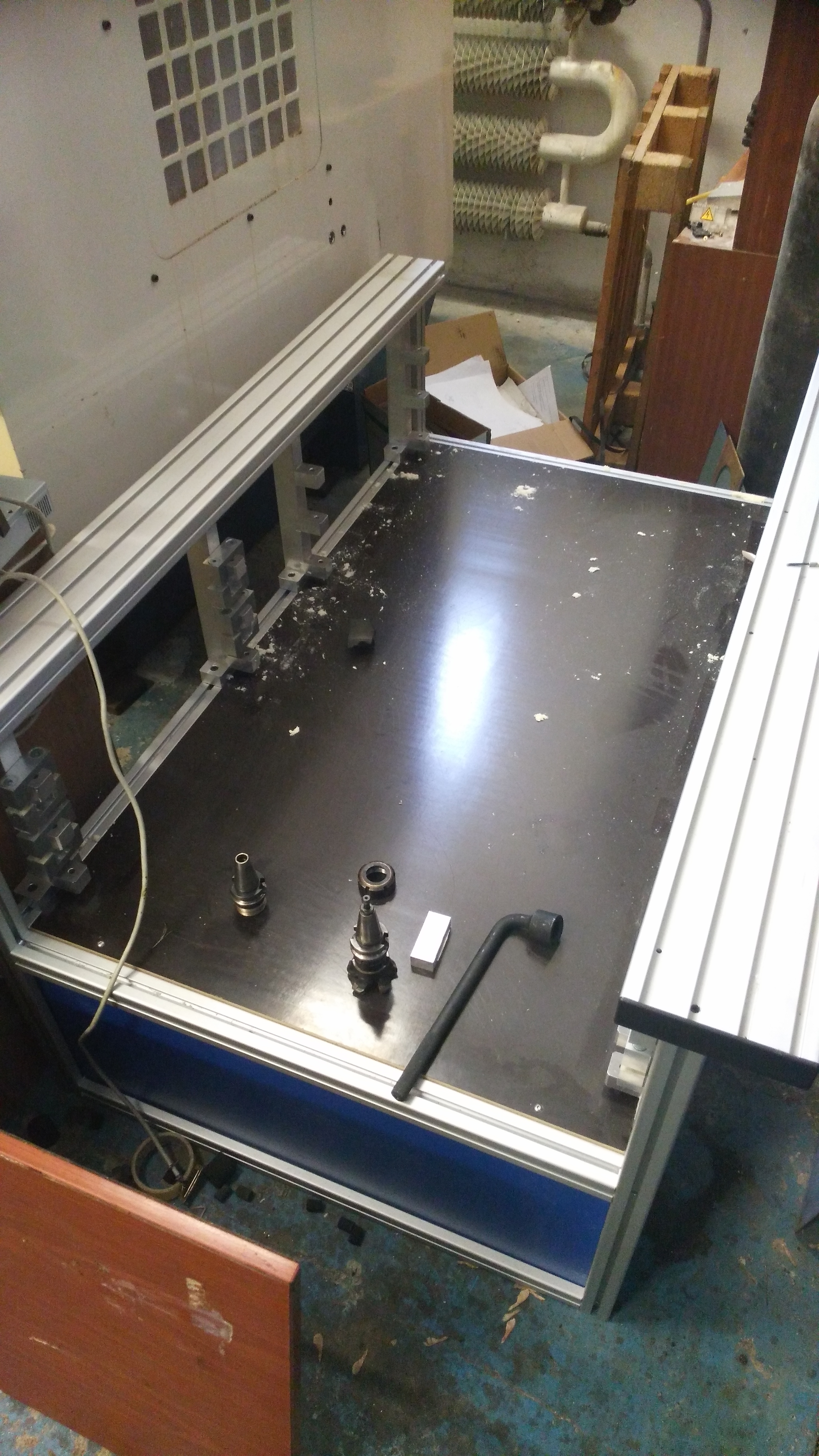 Prodám stůl který byl určený pro portálovou frézku. Stůl je na nožkách a ve spodní části je prostor oddělený od stroje deskou. Po stranách jsou 2 profily na kterých byla původně upevněná portálová frézka. K tomuto stolu je pracovní deska s T drážkama. Síla desky je 20mm. Rozměry desky jsou 1260x620mm - je to ní mírně 3x zavrtáno ( cca do hloubky 1mm). Deska je ze dvou kusů. Tato pracovní deska se dá manuálně polohovat cca po 100mm do 3 pozic. Délka konstrukce 1410mm.