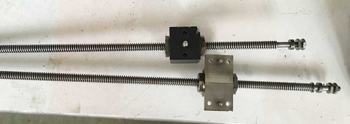 1/ dva kousky trapézových šroubů průměr 11,85mm stoupání 3mm. Jeden má délku 560mm vč. opracovaných konců , šroubovice 470mm a druhý má délku 630mm vč. opracovaných konců , šroubovice 540mm. Oba mají dvojité nastavitelné a mazatelné matky. Cena za oba 800.