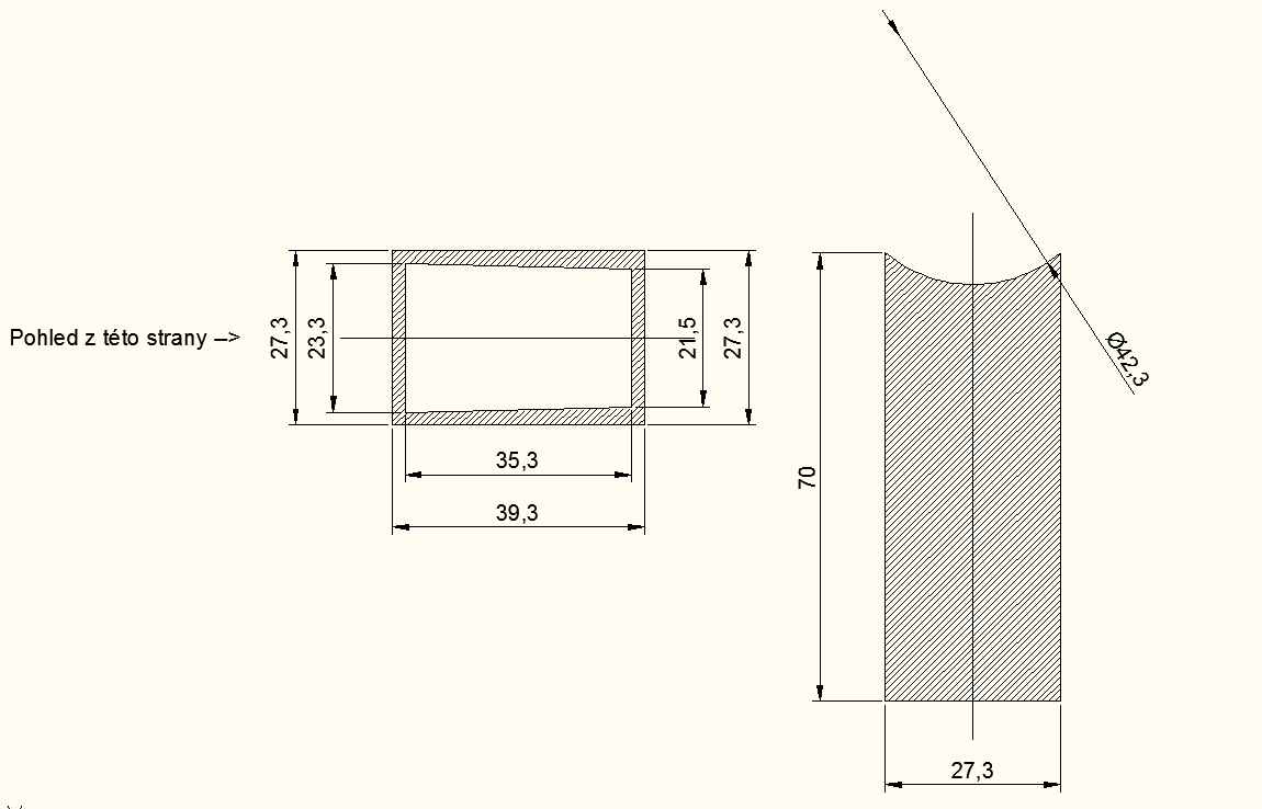 Pro jistotu ještě tvar popíšu. Kus by měl být z plného materiálu, kde bude vyfrézovaný otvor - rozměry na výkresu o délce cca 70 mm kde ve vrchní části je obloukové vybrání (průměr je 42,3mm).