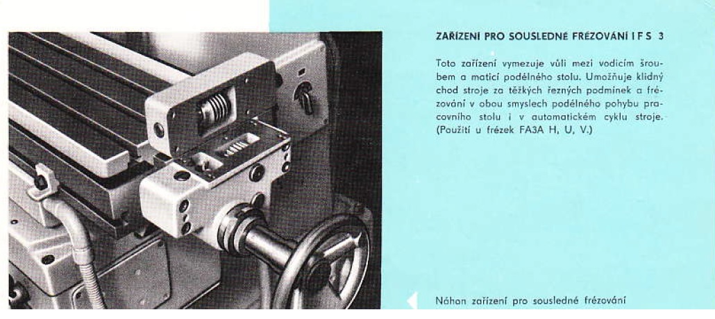 U FA3AU mam nějaké zařízení pro sousledné frézování zabudované už z výroby na matici podélného posuvu. Ta je vlastně dělená a druhá část se v ní pomocí strmého závitu otáčením posouvá a tím se vymezuje vůle šroubu. Posouvání se dělá kolečkem pod stolem na točně.