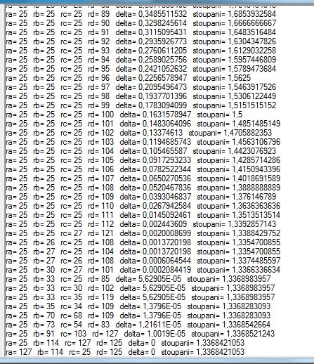 doncarlos píše:Tak tady máš tabulku, ra=počet zubů na vřeteníku, rb a rc na společné hřídeli, rd na posuvovém šroubu, zabírá ra do rb, a rc do rd. delta je odchylka