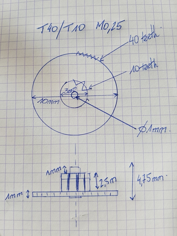potřeboval bych z plastu vyrobit 2 kusy miniaturního ozubeného kolečka/převodu modulu 0,25. Kolečko má 40 a 10 zubů, celkový průměr 10 mm, další rozměry foto níže. Je to z převodovky digitálních překlápěcích hodin SONY-TFM C650WL.