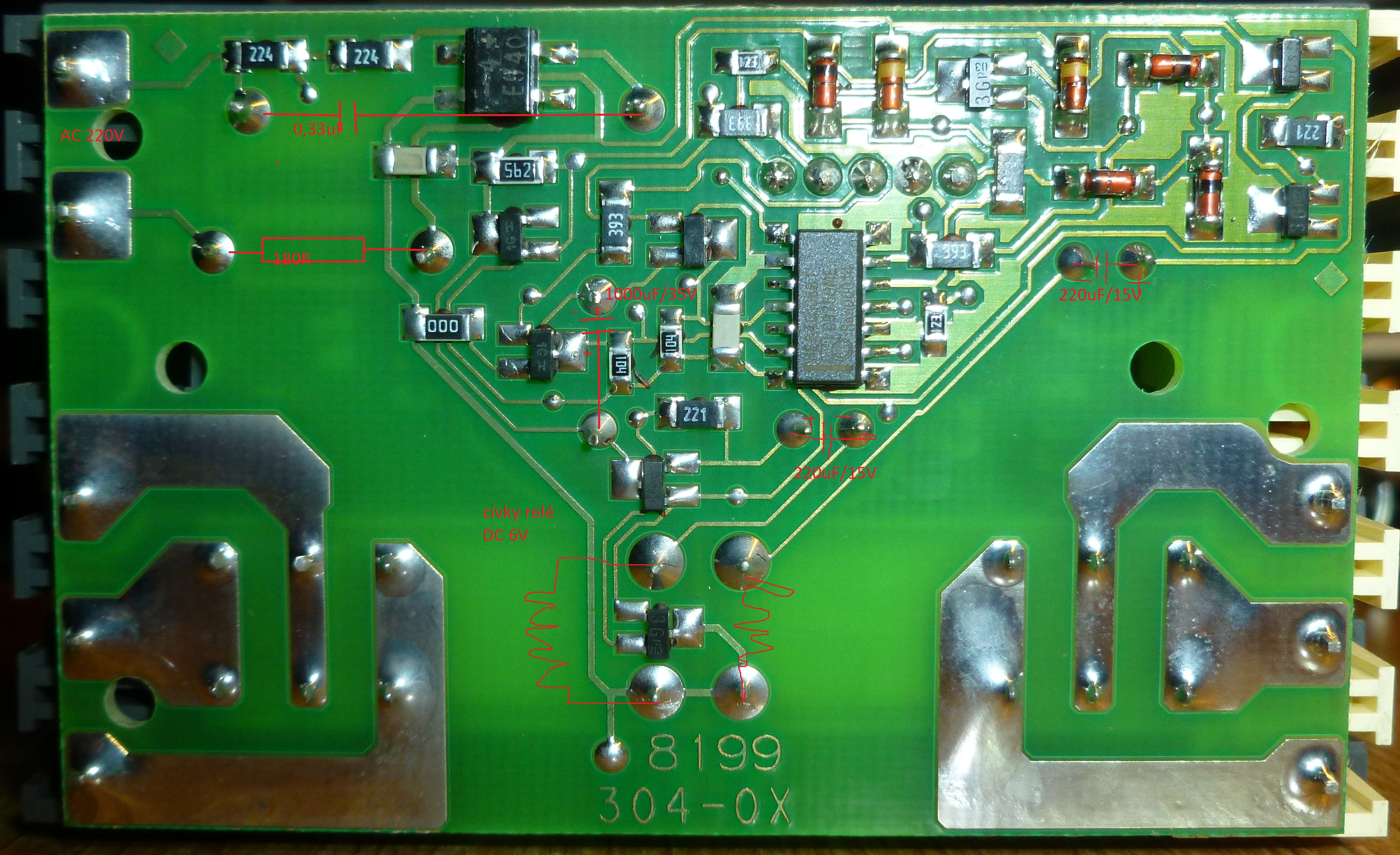 výkonová deska je jednostranná, z druhé strany je jen pár vývodových součástek domalovaných na fotce, je to obvod napájení ze sítě, filtrační ellyt ss napájení a výstupní ellyty viz dále