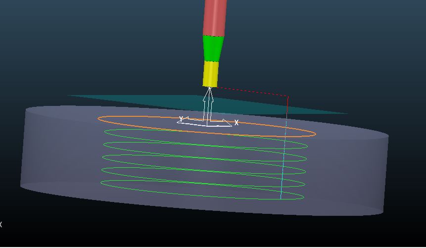 Přikládám obr. jak mi to SW vykresluje. Je zde vidět kolmá čára sjezdů mezi vrstvami. Stroj místo toho aby jel hladce spirálu dolů po obovodě kružnice tak v tom sjezdové místě cukne natvrdo o 0,5 níž a pokračuje další vrstvu. Moc plynulé obrábění to teda není