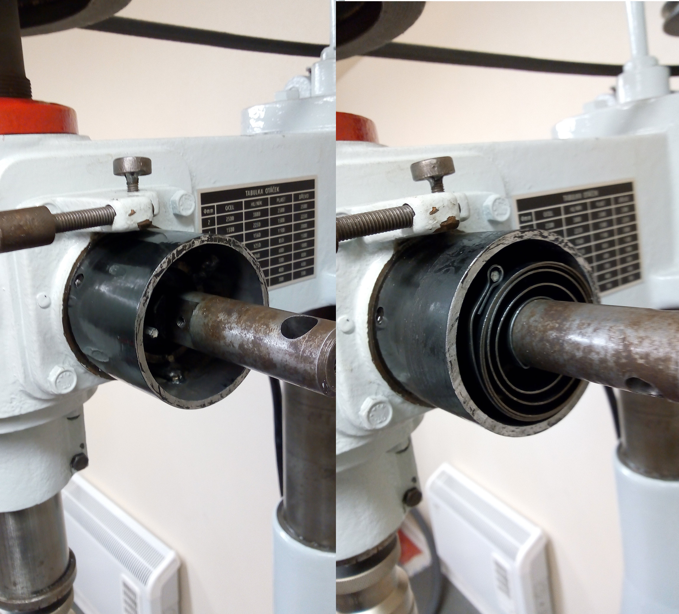Tak vďaka @Mlynekovi sa mi podarilo pozvárať mechanizmus pružiny a dorazu pri vŕtaní.