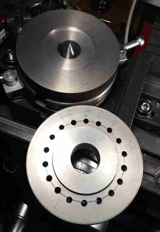 Pak bylo nutné připravit vrtací otvory jako šablonu - bohužel jsem neuměl přesně odměřit tak jsem přípravek umístil na děličku vycentroval na 0,01 mm a vrtal po 0,2 poloměru po 20° viz obrázek.
