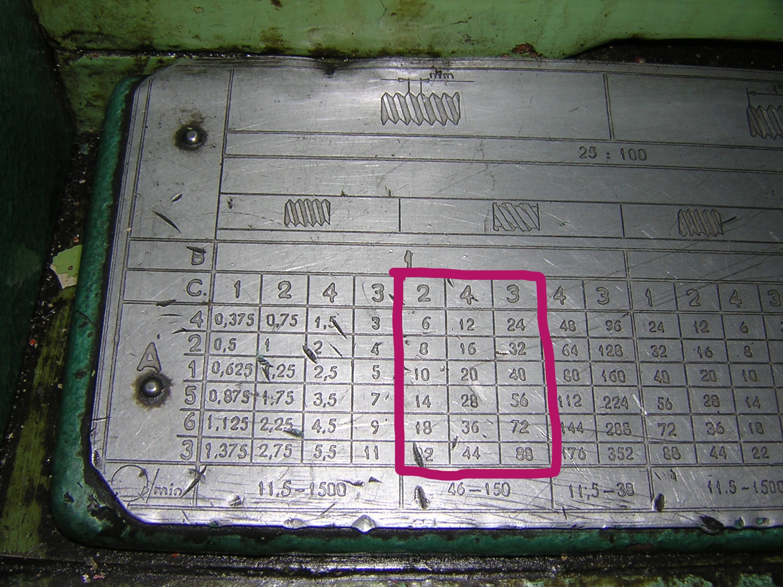 Posuvy pro řezání závitů se nastavují pomoci pák na skříni. Dle tabulky je to páka A,B,C tu nastavite dle tabulky na hodnotu vycházející z požadovaného posuvu. Je to jednoduché :)
