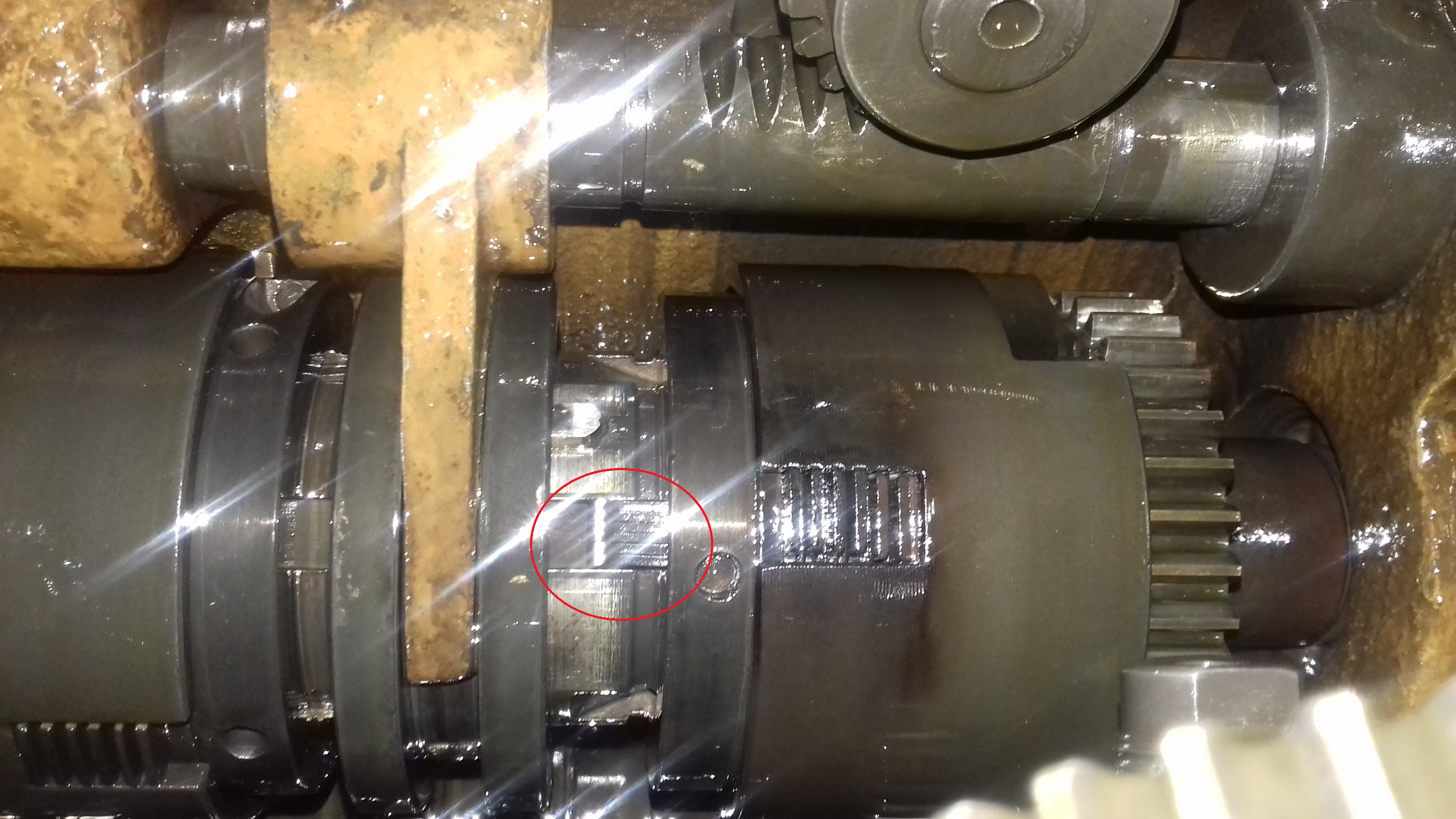 Problém č.2 je vôľa a hádzavosť vretena. Vôľa bola cca 0,05mm, po dotiahnutí zadnej matice (zelený kruh) bola 0,01mm. Nezdá sa mi to ako správny spôsob nastavenia vôle. Tu niekde som čítal že sa to robí hrúbkou vymedzovacej podložky medzi prednými ložiskami. Je to tak? Predpokladám, že prednou maticou sa len zaisťujú ozubenia. Tiež ma trápi hádzavosť vretena 0,06mm. Dúfam že to bude primárne od ložísk a výmena pomôže. Zatiaľ som to nerozobral aby som zmeral samotné vreteno.