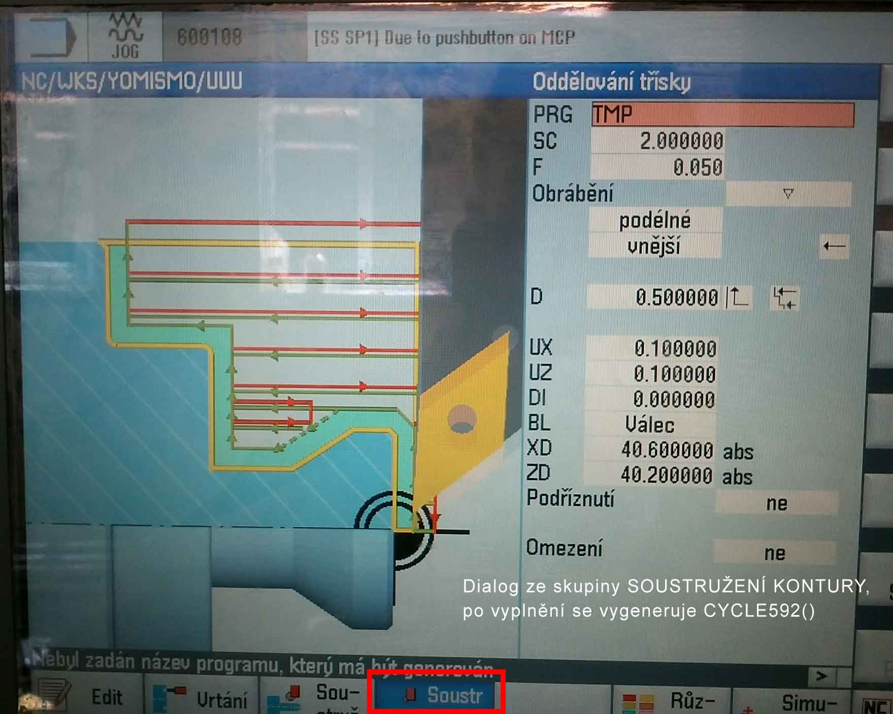 SINUMERIK pouzivame s dialogem, jsou tu dve skupiny soustruzeni, s a bez kontory. Primo pres dialog vyvolat cyklus CYCLE95 nejde, ale pokud jej napisi do G-kodu rucne tak se sam zmeni na dialog a lze ho upravovat. Misto nej je tu CYCLE951.