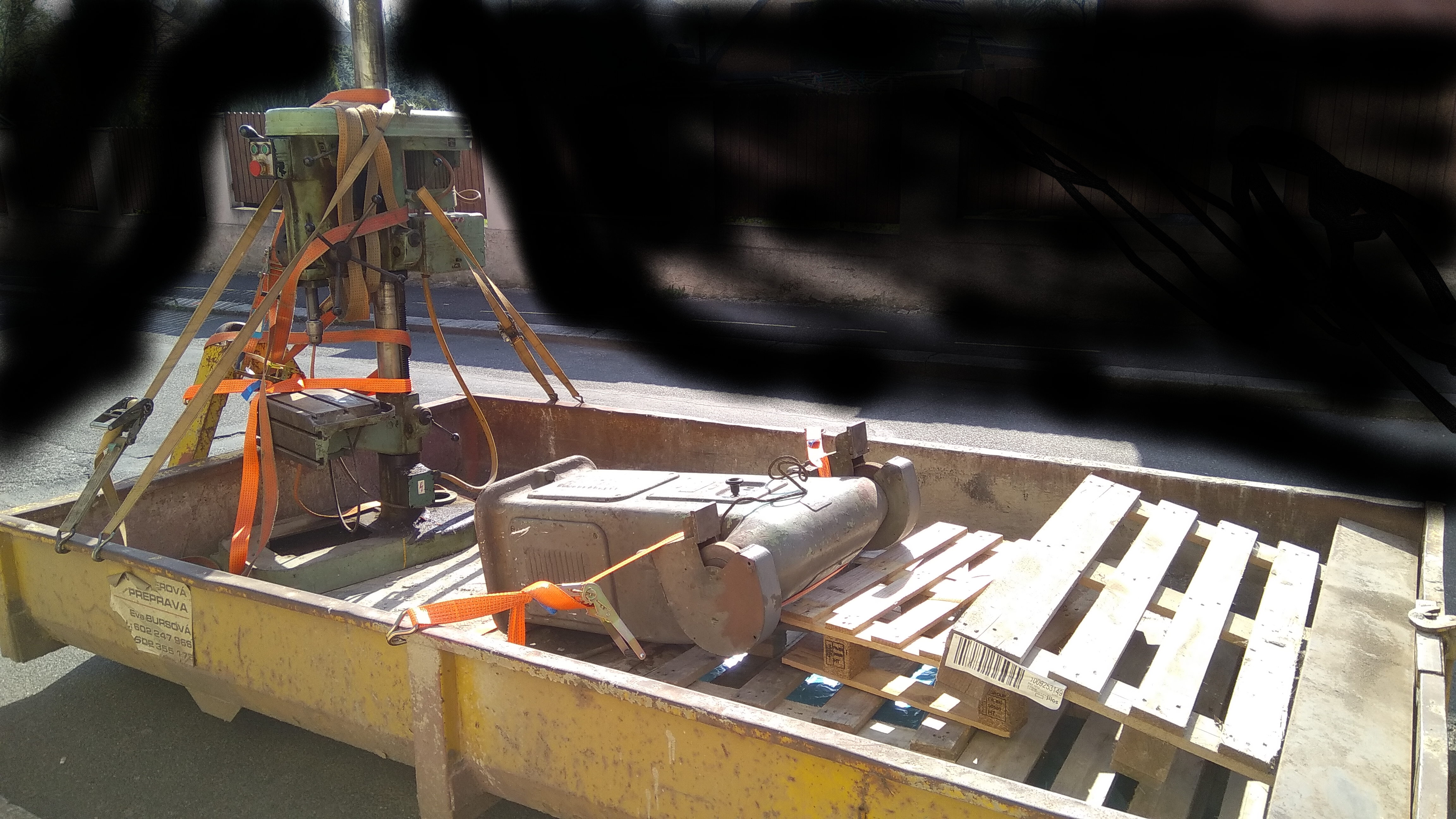 Nakonec jsme to dostali domů 8) :D Mám šílenou radost, že mám konečně "nějaký stroj doma" :twisted: Původně jsem to chtěl prodat, protože jsem si myslel že se to nevejde, ale nakonec jsem i přesvědčil tátu :D Tak jsme objednali kontejner. V 8:40 přijel s destou a naložil to pán na kontejner. Přikurtovali jsme to. Odvezl to k nám a tam začal problém :lol: Výška :o Myslel jsem že zajede v pohodě destou až ke garáží a tam paletákem to naložíme, ale bylo to moc vysoké (vrata mají 2,2m. vrtačka skoro 2m) A ještě nad vraty je taková stříška :roll: Takže jsme pod to hodili lešenářské trubky, a posunuli ručně. A takhle jsme to tam dostali :D v 10:35 už nakládal destu a paleták. Jsem rád že jsme to s mámou a pánem od nákladáku zvládli. Ještě to bude chtít o něco posunout, ale to až o víkendu. Bruska šla v pohodě destou až na paletak do garáže, takže super.