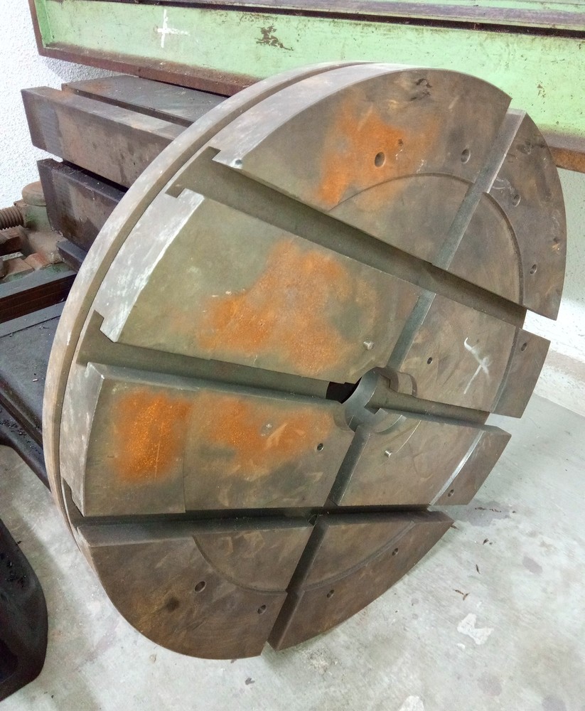 Když jsem o tom přemejšlel vic, napadlo mě, že by tam mohl bejt otočnej stůl, protože křížovej posuv by byl řešenej na vrchu, a tak jsem znova zajel do šmelcu a dovezl si hotovej stolek z padesátky stolu, bude chtít trochu srovnat do roviny, je to nějakej atyp, ale je novej a to se cení.