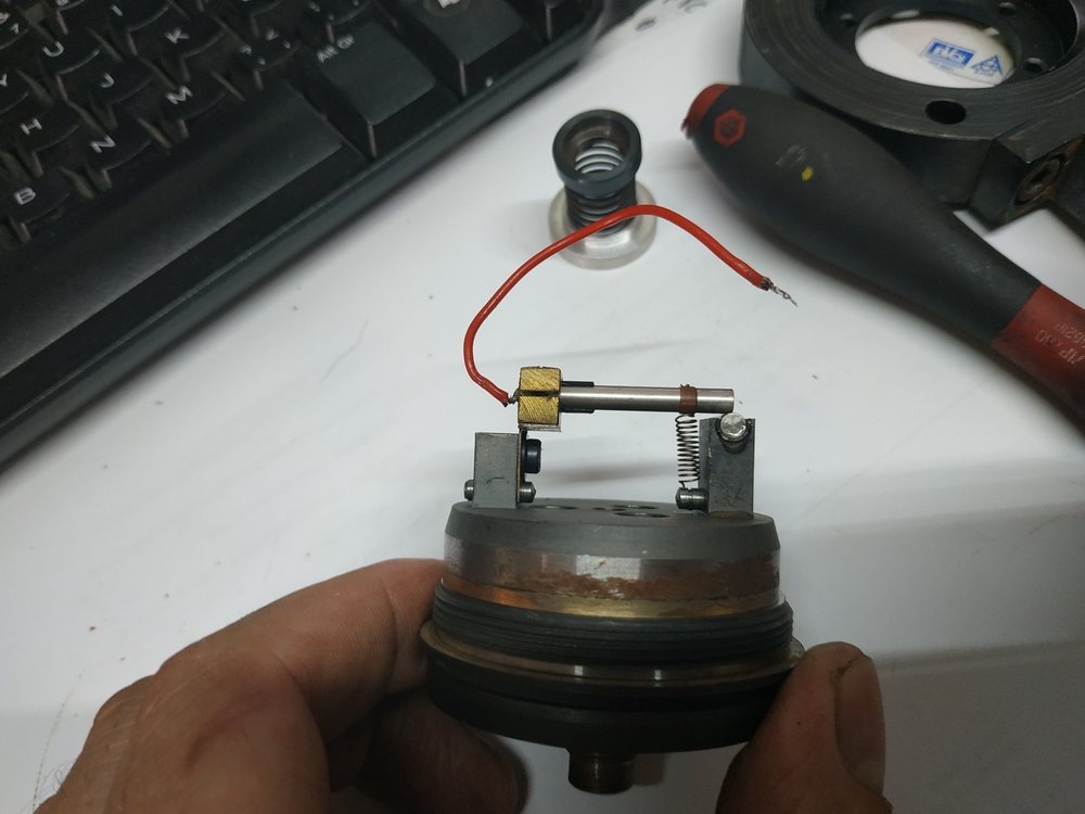 Ta tycka napric z jedne strany v mosazne kostce z druhe pod perkem je protikontakt a cely je na pohyblive zakladne a chodi spolecne s tykadlem
