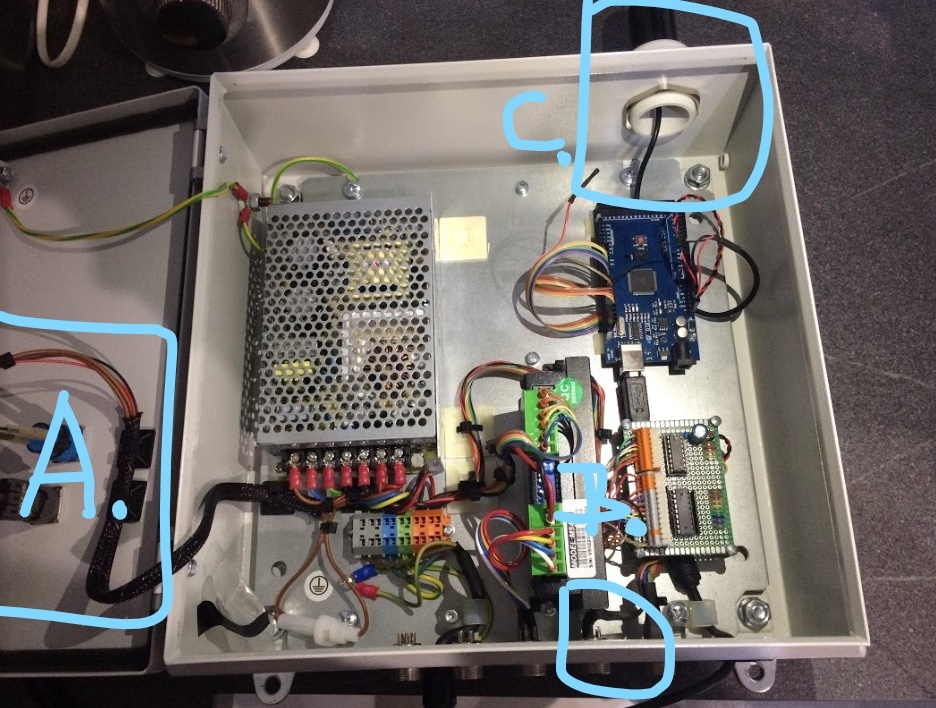 3. Některé věci jsme zrušili a není potřeba se jimi zabývat (A. spínač na celou krabici – nechceme, stačí zásuvka, B. dálkové ovládání, C. 6 tlačítek nepotřebujeme, některé kabely ve svorkovnici nebudou potřeba), viz. Img5