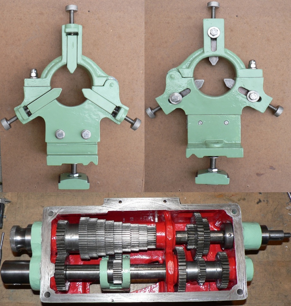 Co se týká čištění…dva roky soustruh stál v dřevěné boudě bez pohybu, takže někde to chytlo „lišku“ např. v nortonce na ozub. kolech. Takže ozub. kola do sklíčidla na druhý soustruh a jen boky velmi jemným smirkem a liška byla pryč. Hřídele byly bez koroze, ale konce měly lišku, takže zase na soustruh a jemně smirkem. Beru to vždy tak, jestli daná plocha součástky má na něco vliv a podle toho se rozhodnu. Stejně povrchovou ochranu to nemá žádnou. Spojovací materiál a kličky pokud to půjde budou nerez. To vroubkování očistit neumím, tak to raději vyrobím nové. Některé věci pojišťuji Loctite 243. Nortonka je „daná“ na tmel Dirko (mám doma zbytek tuby), aby se ztrátové mazání nevydávalo úplně všemi směry. Na nortonce budu mít pak nějakou odkládací plochu na šupleru, proto tam mám nachystané ty dvě horní matice. Hřeben jsem smirkem očistil jen pohledovou stranu, zuby vyčistil kartáčem, zbytek byl dobrý. Většinu věcí před montáží mažu olejem. Lože bylo naštěstí celé mastné a pokryté „prachem“ z mosazi. Takže jsem ho odmastil a projel kamínkem, protože tam byly nějaké malé záseky.