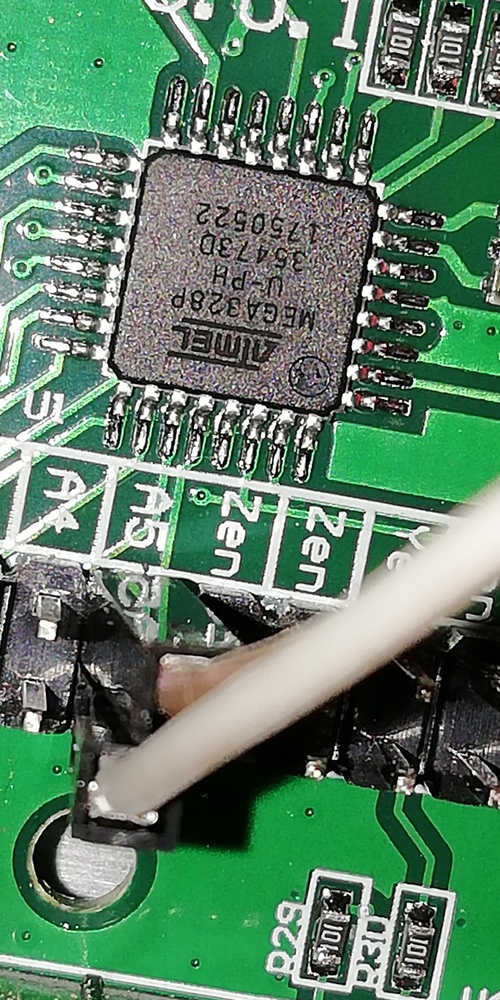 Teď jde o to, jak ho dostat dovnitř. Kdybys poslal fotku celé desky a ne jenom její kousek, tak by tam bylo vidět, jestli je na ní SPI programovací konektor (standardně by měl mít 6 pinů), nebo jestli se nějak rozumně na ty piny dá dostat. Nakonec kdyby tam konektor nebyl a když to stejně budeš letovat, ta tam v nejhorším můžeš dočasně naletovat 4 potřebné dráty.
