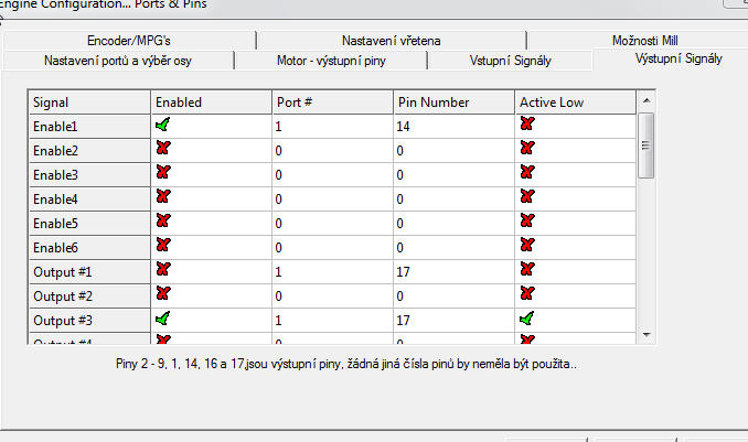 - v tabulce přiřazení signálů odklikni na řádku Spindle políčko Step Low Active (výstup máš zapojený proti zemi, takže je aktivní v High)