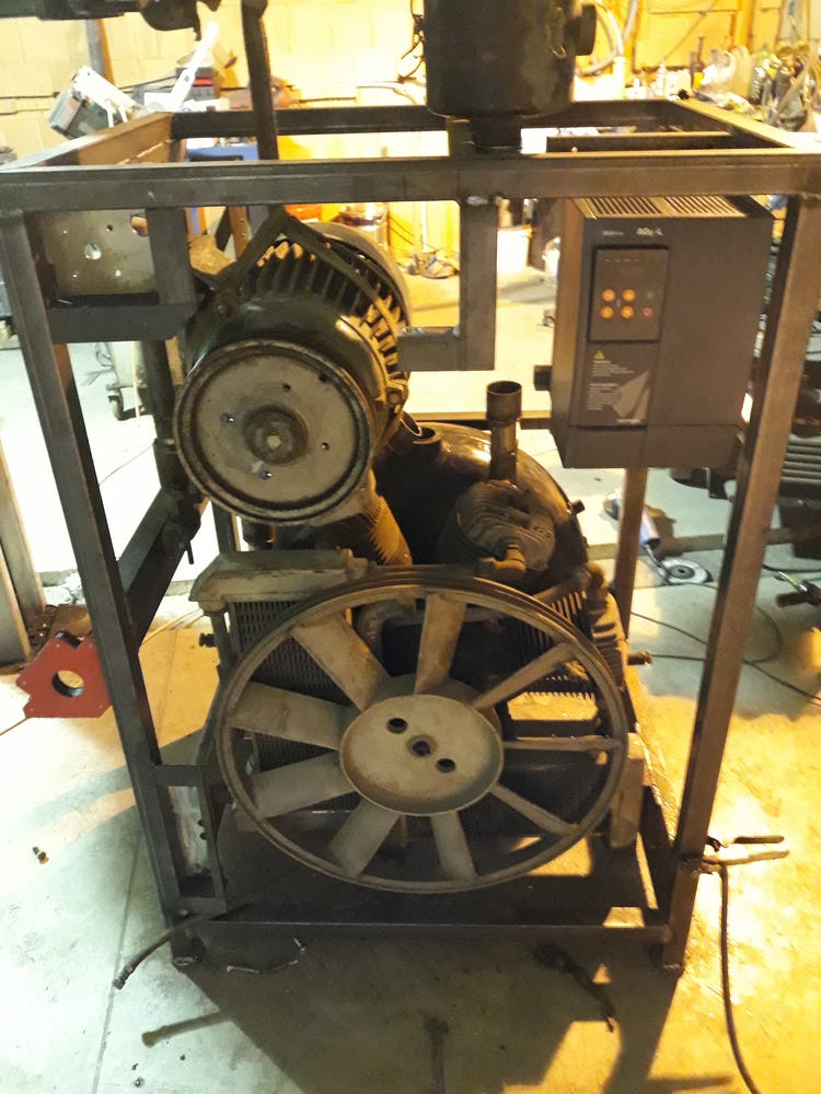 Kompresor stál původně na 1000l vzdušníku a měl k sobě 15kW motor.Je to dvoustupňový 4 válec. Maximální tlak 16 Atm. Chtěl jsem něco co mi vejde do technické místnosti, tak jsem předělal do "bedny".