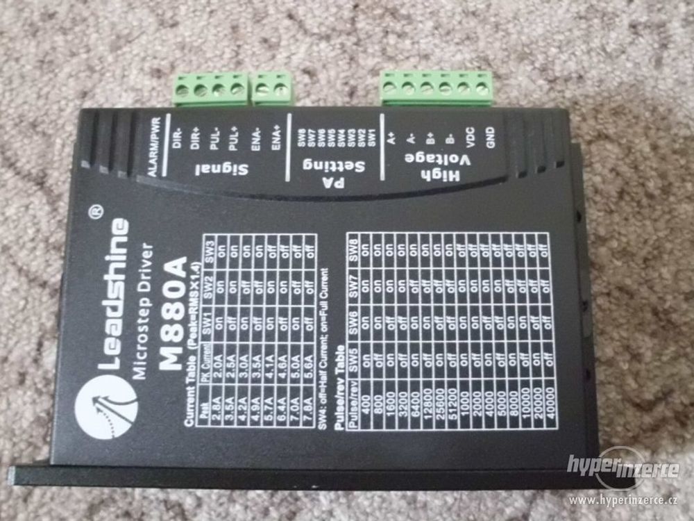prodám 2ks driverů M880A pro 2-fázové krokové motory, max. 80V, 7.8A. -Napájecí napětí do +80VDC, špičkový proud do 7,8A -Nastavení proudu fáze od 1,8 do 7,8A (8 hodnot) -16 volitelných rozlišení kroku až do 51200 kroků/ot -Maximální vstupní frekvence 300 KHz -Opticky izolované vstupní signály -Vhodný pro 2-fázové a 4-fázové krokové motory -Ochrana proti zkratu na výstupu, podpětí a přepětí napájecího napětí -Automatická redukce proudu po zastavení motoru.