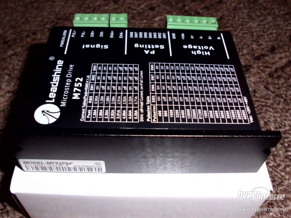 Dále prodám 1ks driver M752 - driver pro 2-fázové krokové motory, 75V, 5.2A. -Napájecí napětí do +75VDC, špičkový proud do 5,2A -Nastavení proudu fáze od 1,26 do 5,2A (8 hodnot) -16 volitelných rozlišení kroku až do 51200 kroků/ot -Maximální vstupní frekvence 300 KHz -Opticky izolované vstupní signály -Vhodný pro 2-fázové a 4-fázové krokové motory -Ochrana proti zkratu na výstupu, podpětí a přepětí napájecího napětí -Automatická redukce proudu po zastavení motoru.