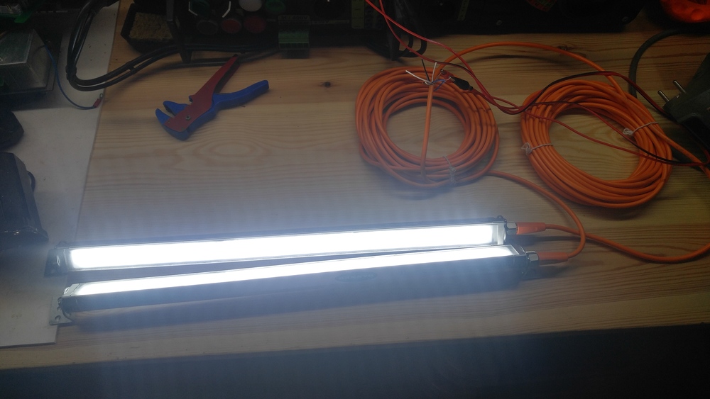 Tak tu mam zase dve krasna svetla. Maji veliky vykon, jsou dlouha 50cm. Svetla jsou vcetne naklapecich drzaku a vcetne novych 10m kabelu s konektor M12. Cena za kus je 400kc pri odberu obou najednou je postovne na me.