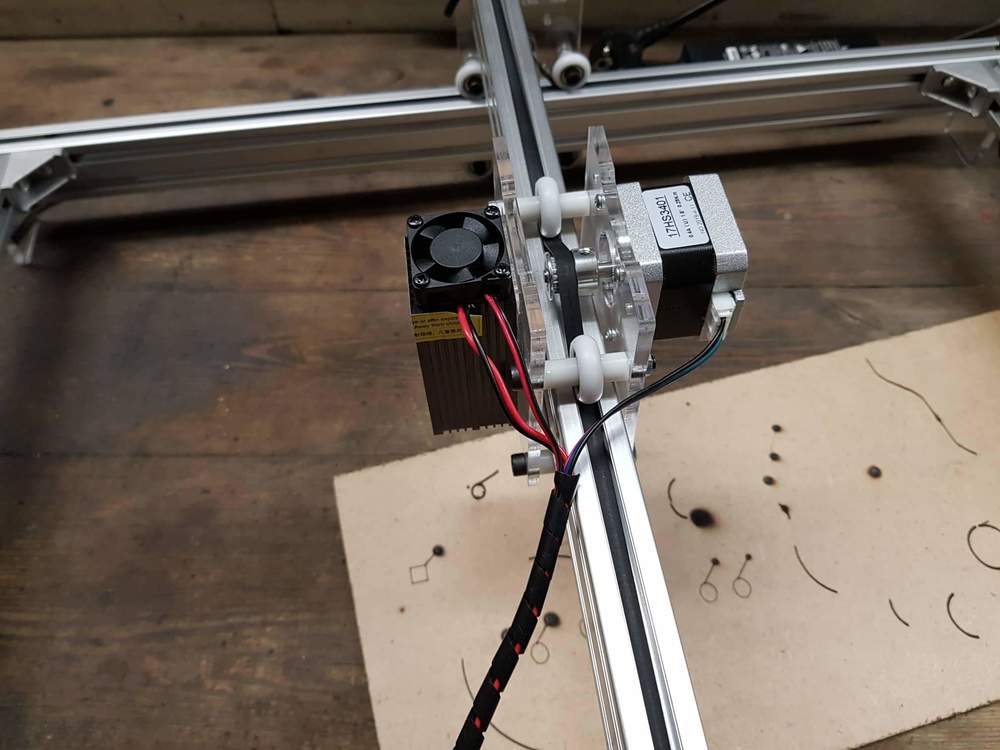 Na jednom z obrázku je vidět jak to vypaluje, když to stojí a musím zapnout ručně laser, tak to vypálí kolečko, poté přejede na dané místo a udělá kolečko nakreslené v programu.