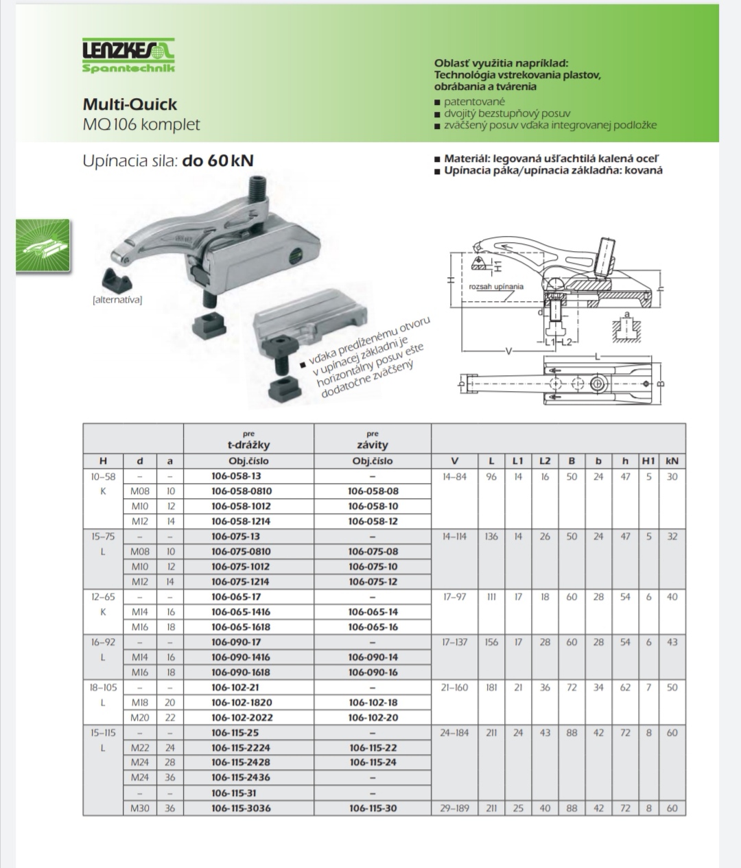 Ahoj, prodám velmi kvalitní kované upínky z legované kalené oceli od německého výrobce LENZKES - nové nepoužité! Upínky mají velkou upínací sílu bez vlastní deformace a široké pole využití. Všechny potřebné informace (rozměry, upínací síly, způsoby uchycení atd.) naleznete níže v pdf. Katalogu - řada MQ 106 + číslo upínky