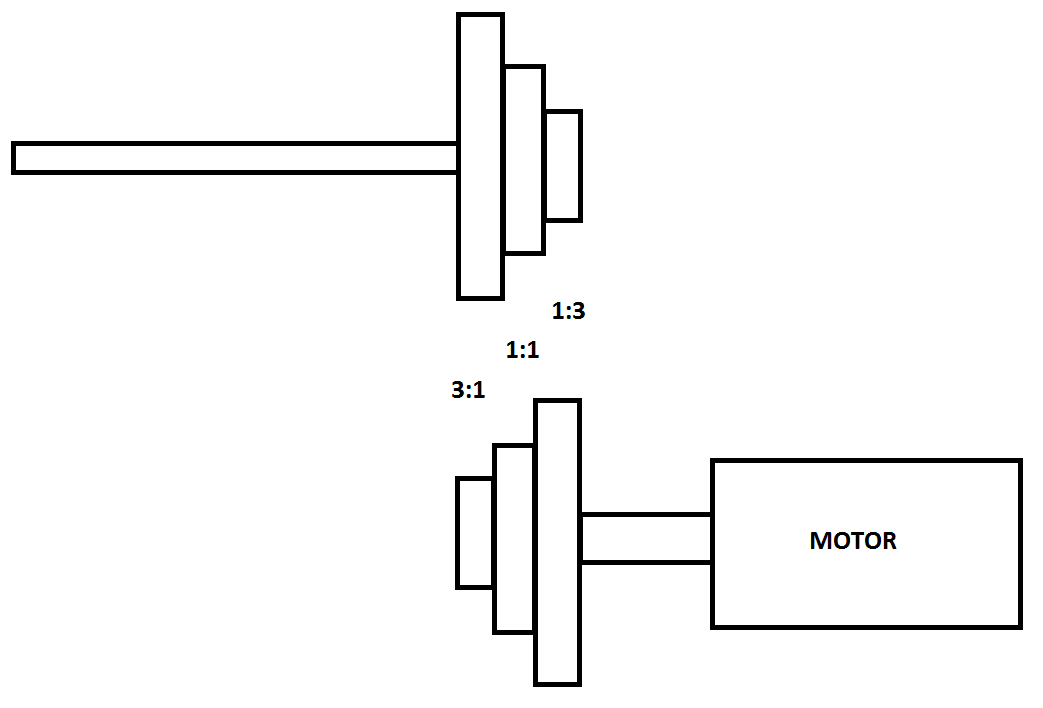 Potřeboval bych na svím soustruhu udělat převod mezi motorem a předlohovou hřídelí systémem tří převodů a to v poměru 1:3 - 1:1 - 3:1 - VIZ obrázek