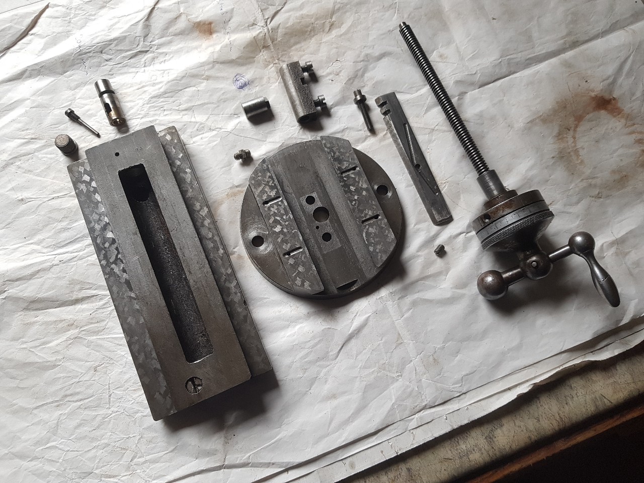Kromě asi nekompletního podavače k tomu mám navíc dva pákové supporty, jeden jednoduchý a jeden dvouosý. Nevím, co jsou přesně zač, nenašel jsem je zatím v žádném katalogu, ale na lože sedí. Přemýšlím, jestli by ten dvouosý časem nešel upravit pro jednoduchý CNC režim, má to rozjezdy 100x80 a je to fest masivní. Případně to za něco vymění. Časem bych se rád dopracoval k frézovacímu přípravku.