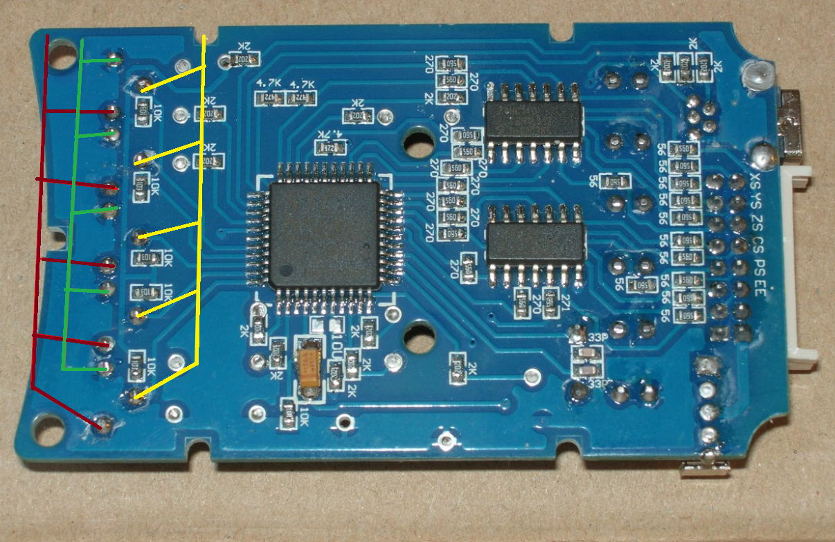 Nemůžu na internetu najít žádný ovladač, co by měl jeden potenciometr pro všechny osy a fungoval bez pc. Tak se chci zeptat, jestli by nešlo vzít tento ovladač : viewtopic.php?t=9467 a nahradit všechny trimy jedním potenciometrem pro všechny osy. Bohužel nedokážu z těch fotek vyčíst, jestli by přemostění jako na obrázku nezpůsobilo, že by všechna tlačítka ovládaly všechny osy. Má někdo nějakou podobnou zkušenost s takovou úpravou? Budu vděčný za každou pomoc, klidně tip na jiný ovladač, cenově by bylo fajn se ale vejít do