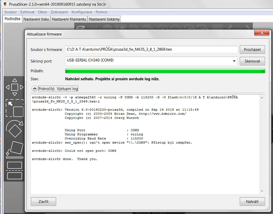 avrdude-slic3r -v -p atmega2560 -c wiring -P COM9 -b 115200 -D -U flash:w:0:C:\D A T A\arduino\PRŮŠA\prusa3d_fw_MK3S_3_8_1_2869.hex:i