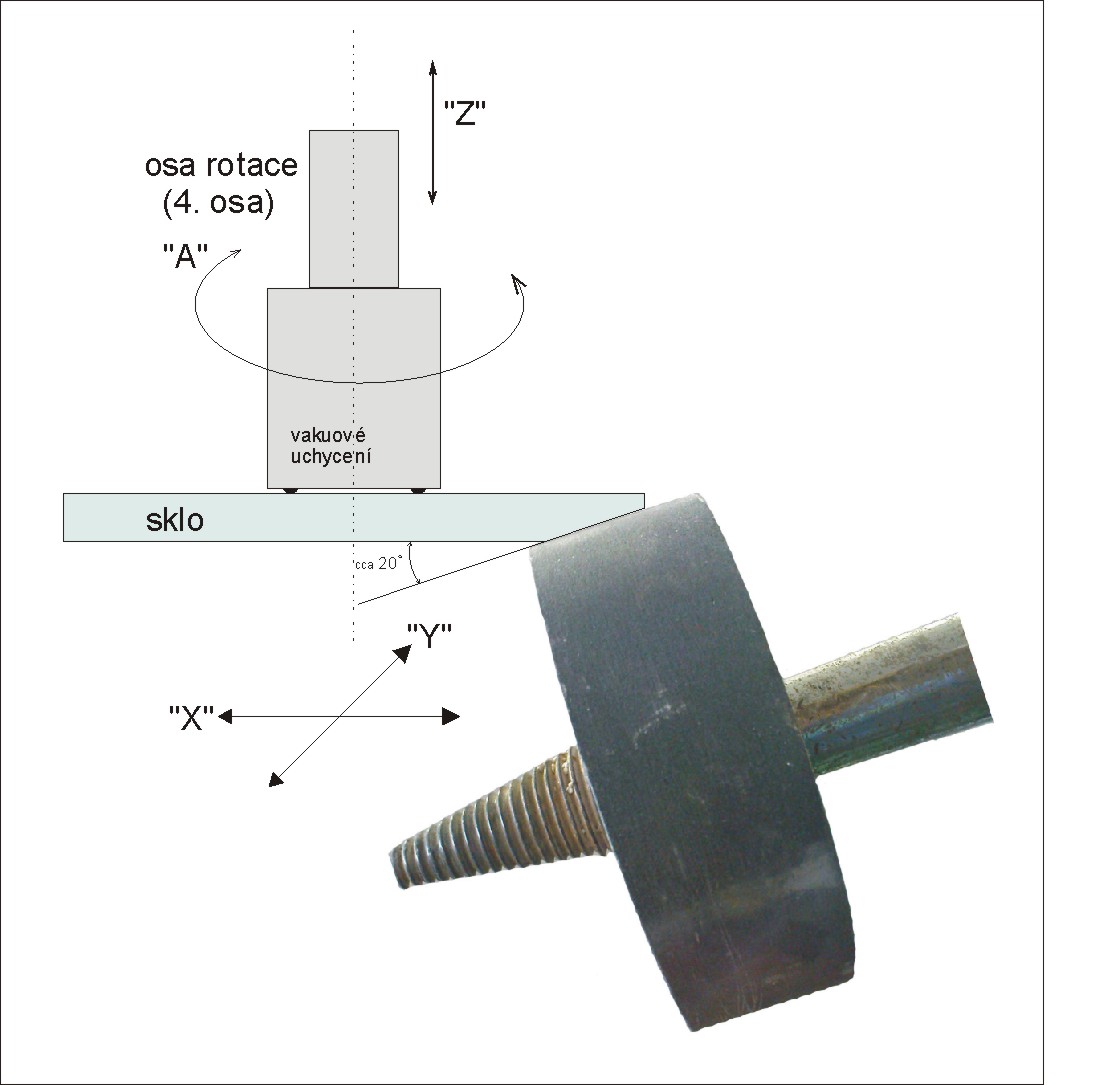 Přemýšlel jsem nad počtem os a myslím, že by to šlo i se čtyřma. Kdyby se vřeteno nastavilo na úhel fazety, tak by stačily osy 4. Možná si to ale nedovedu představit správně.