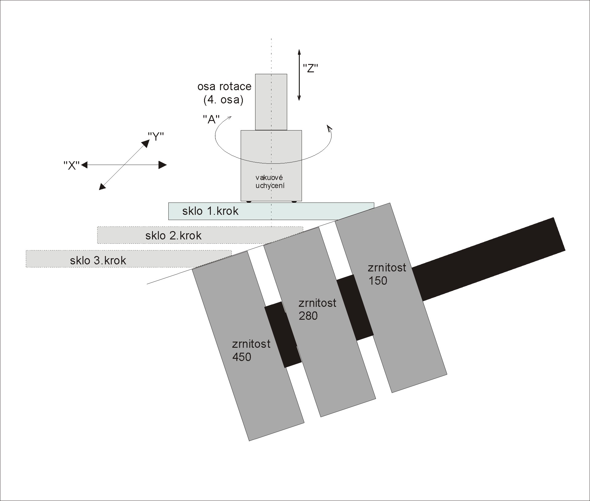 Tvary jsou i konkávní. Ale i tak je potřeba osa Z. Potřebuji to sklo "přisávat" pořád na stejném místě. Sklo bude v zásobníku, Z dojede, sjede , přisaje, odjede, obrousí a dá někam jinam. Sakra, jím klobásy a ještě nemám prase. Ale tak bych to chtěl mít. O tvarových kotoučích jsem uvažoval, ale je to s výrobou složitější a dražší. Na obrázku je variamta s třemí kotouči s různou zrnitostí. Mezi přechodem na jinou zrnitost oplach vodou. Ale je možné, že nečistoty z hrubého kotouče se dostanou na ten jemný a pak je problém. Při ručním broušení na volném brusivu stačí jedno větší zrnko korundu, které udělá hlubší rýhu a jede se nanovo. Většinou se to zjistí až po vyleštění.