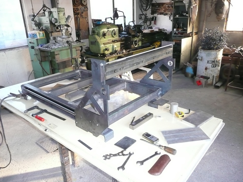 Konstrukce je kovová,osa X jezdí na tyčích 30/1000,kuličková pouzdra,Z-ko je na tyčích 20,Y lin vedení. Trapéz šrouby 16/4,krok. motory 1,9 Nm a 2x 2,2Nm.Už se to hejbá.pod MACHEM 3. [/b]