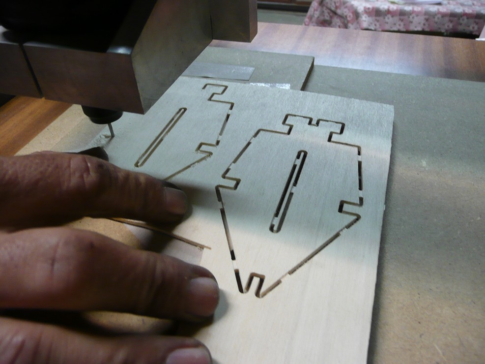 Fézoval jsem to klasickou HSS frézou. Natočil havu o určitý úhel (již si nepamatuji kolik °) a frézoval, poté pootočil hlavu na druhou stranu a bylo to. Celé to bylo frézováno jako komplet v duralovém domečku.