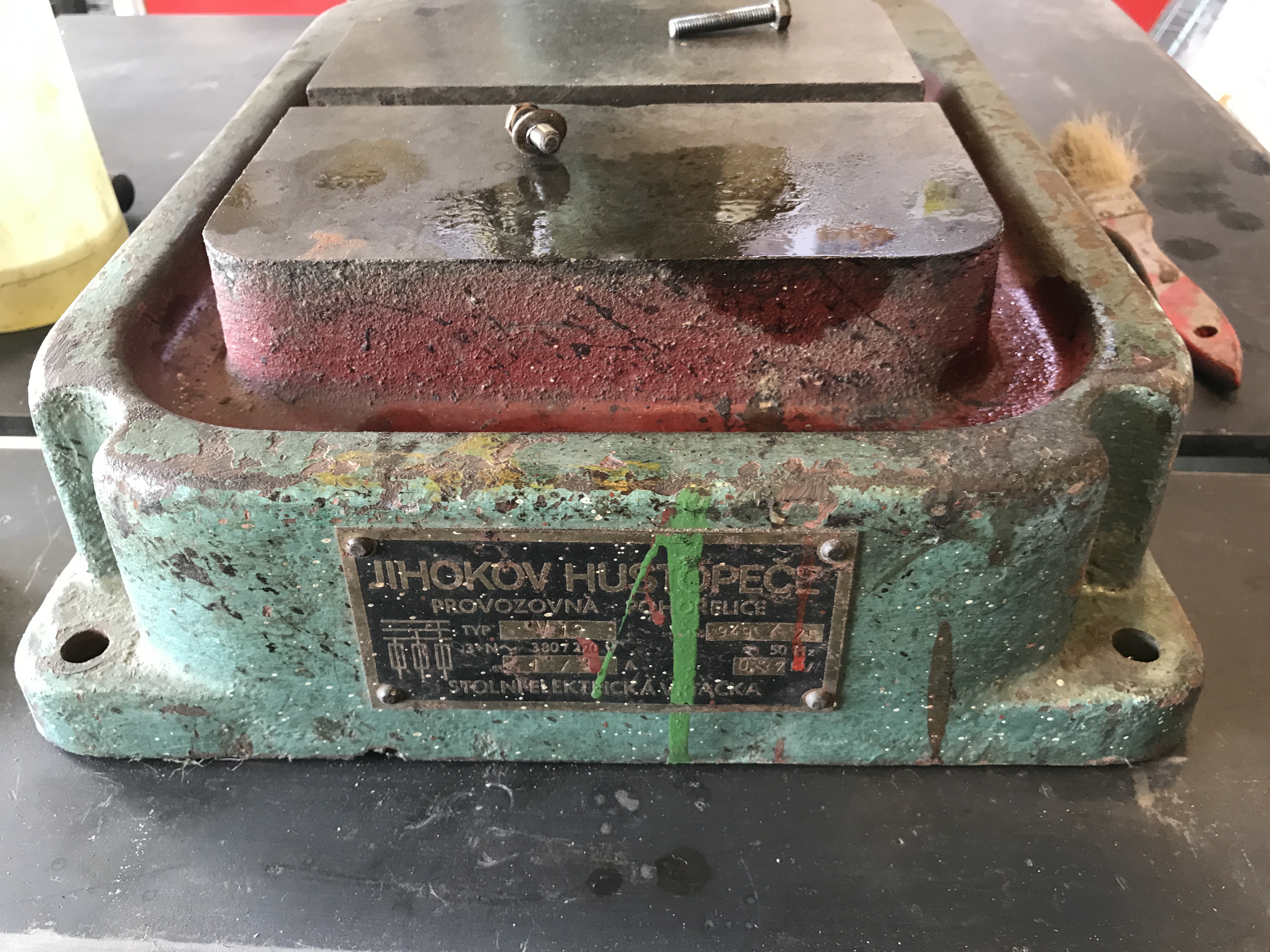 Jinak stroj stal 6tisic korun. Nefunguje vratna pruzina, lak vypada snad puvodni, i kdyz jsou tam podezrele fleky od jine zelene barvy na par mistech.