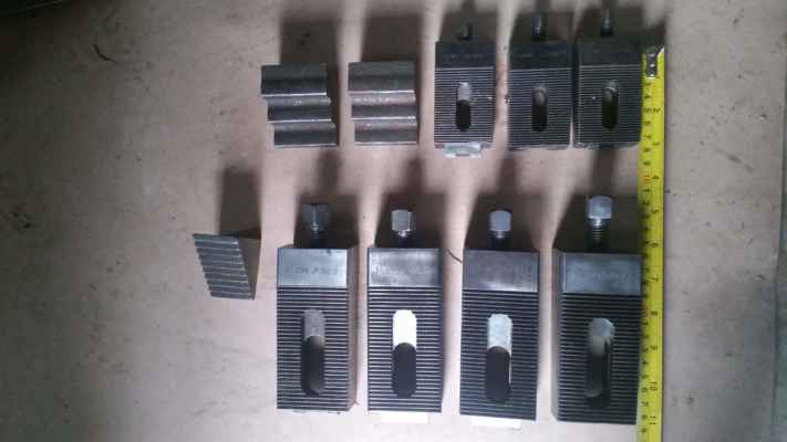 mám tyhle boční upínky pro šrouby M12 z předlistopadové výroby. Mají rozteč drážek 2 mm a vrcholový úhel 60°. Kdysi jsem si na ně dělal příložky pod šrouby z 19 436, nakonec jsem je ani nekalil. K frézování drážkování jsem použil nástrčnou frézu na metrický závit příslušného stoupání. Tyhle frézy nemají zuby ve šroubovici jako odvalovací frézy. Sklon plochy s drážkováním je u mých upínek 8° a osa drážek je na tuto plochu kolmá.