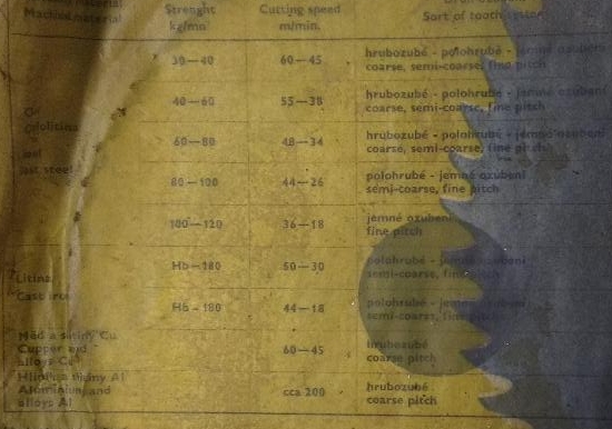 Na starých obalech pilových kotoučů HSS bývala tabulka řezných rychlostí. Tak jsem šel pohledat do skříně, jeden jsem tam ještě našel, snad to bude čitelné:-)