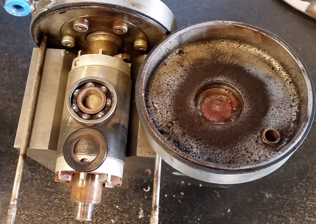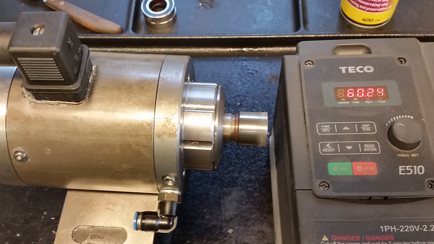 Fréza pr 10 tříbřitá - tvarová, chlazená emulzí. Na motoru byly vrstvičky sanytru od zaschlé emulze. Motor se točil ale bylo cítit že ložiska jsou KO. Po rozebrání jsem zjistil, že je zcela zadřené zadní ložisko a všude jsou stopy tlakové koroze // taková ta rezatá špína //. Zadní ložisko se protáčelo na hřídeli a zcela ji zničilo. Přední ložiska byla kupodivu v docela dobré kondici i když musela dostat "za uši" od uvolněného zadního ložiska. Po otevření krytu v nich bylo mazivo a zřejmě by ještě něco naběhala. Brzdicí O kroužek zadního ložiska byl ztvrdlý a zralý na výměnu Vlnovcová podložka byla odřená a také na výměnu Po konzultaci se zákazníkem jsem rotor vyměnil za jiný - použitý ale bezvadný. Při montáži je nutné všechny šroubové spoje pojistit lepidlem Zadní ložisko je předepínáno vlnovcovou pružinou a bržděno O kroužkem. Musí se axiálně posouvat aby vyrovnalo tepelnou roztažnost a předepínalo zadní ložisko. Je nutné lůžko ložiska namazat vazelínou shodnou s vazelínou ložiska aby nedošlo ke kontaminaci. Při montáži se nesmí do ničeho ťukat ani použít násilí. Na závit matice ER16 je dobré použít protizadírací pastu // nejen při opravě //. Záběh začínám asi na 60 Hz - 15 min FW - 15 min REV - 5 min pauza. Pak pokračuji až na cílovou frekvenci viz doporučení výrobců ložisek. Záběh trvá cca 5 hod !!! Tento Atas je jeden z nejstarších v provozu // má ještě menší rozteč šroubů příruby // a je myslím potřetí na "generálce". Ložiska nyní stála 2424CZK přední // 2 kusy // a 1378CZK zadní // jedno //. Za tu novou hřídel jsem zákazníkovi naúčtoval 1500CZK. Rozborka, vyčištění, drobný materiál // těsnění , O kroužky, odmašťovače a spojovák // montáž a záběh jsem zákazníkovi účtoval 2000CZK. Celá generálka tedy stála 9726, což je cca jedna 7hod směna práce stroje.