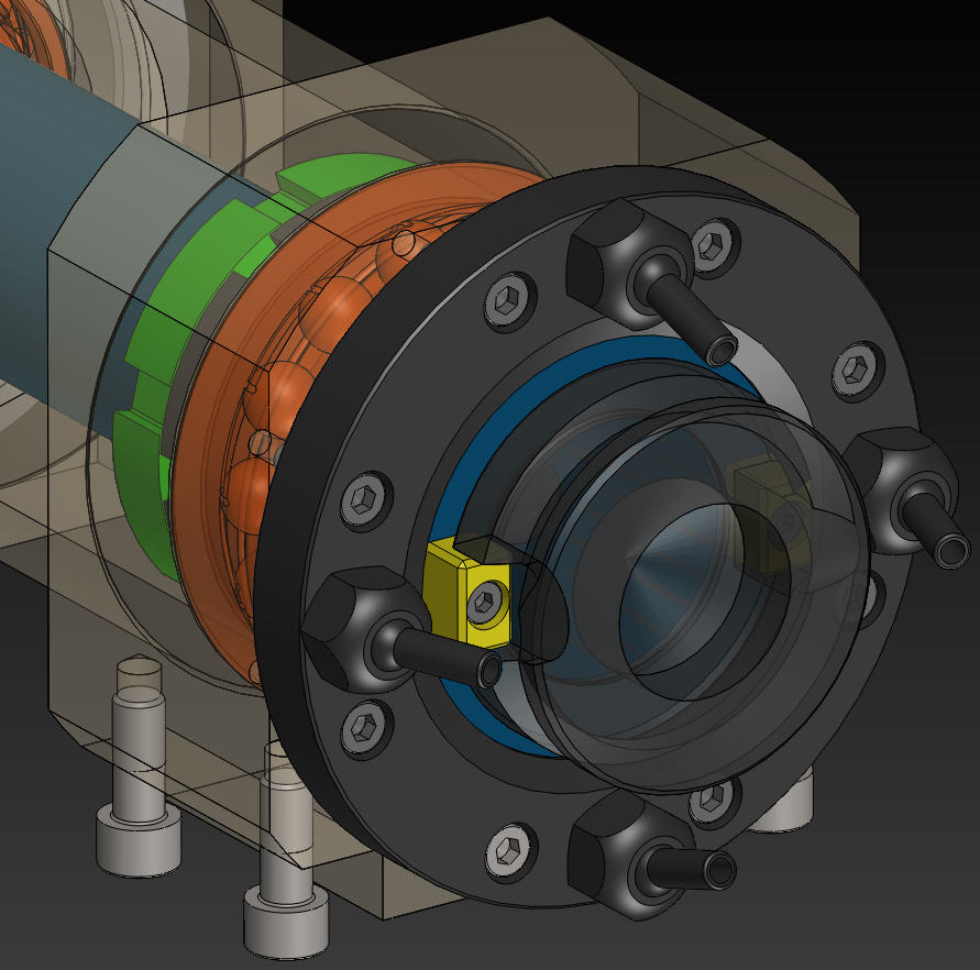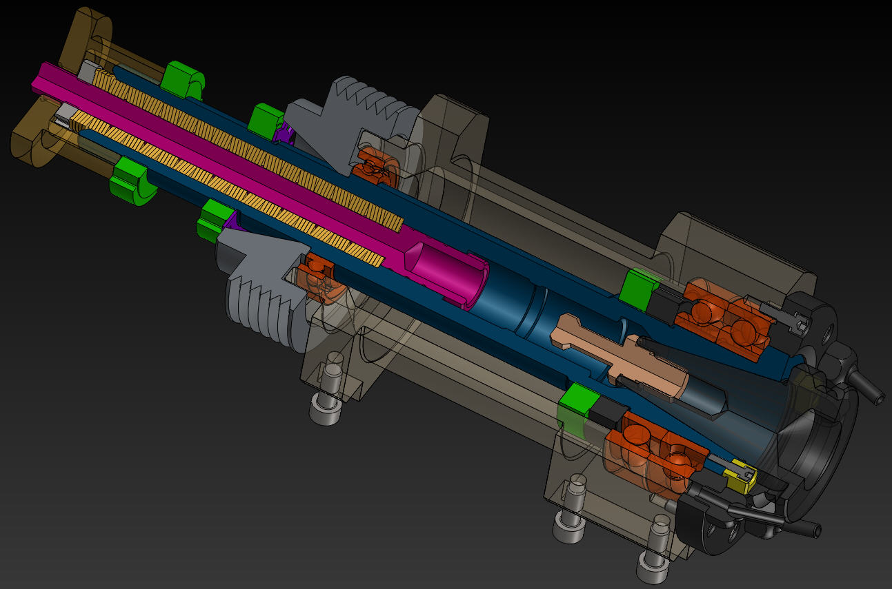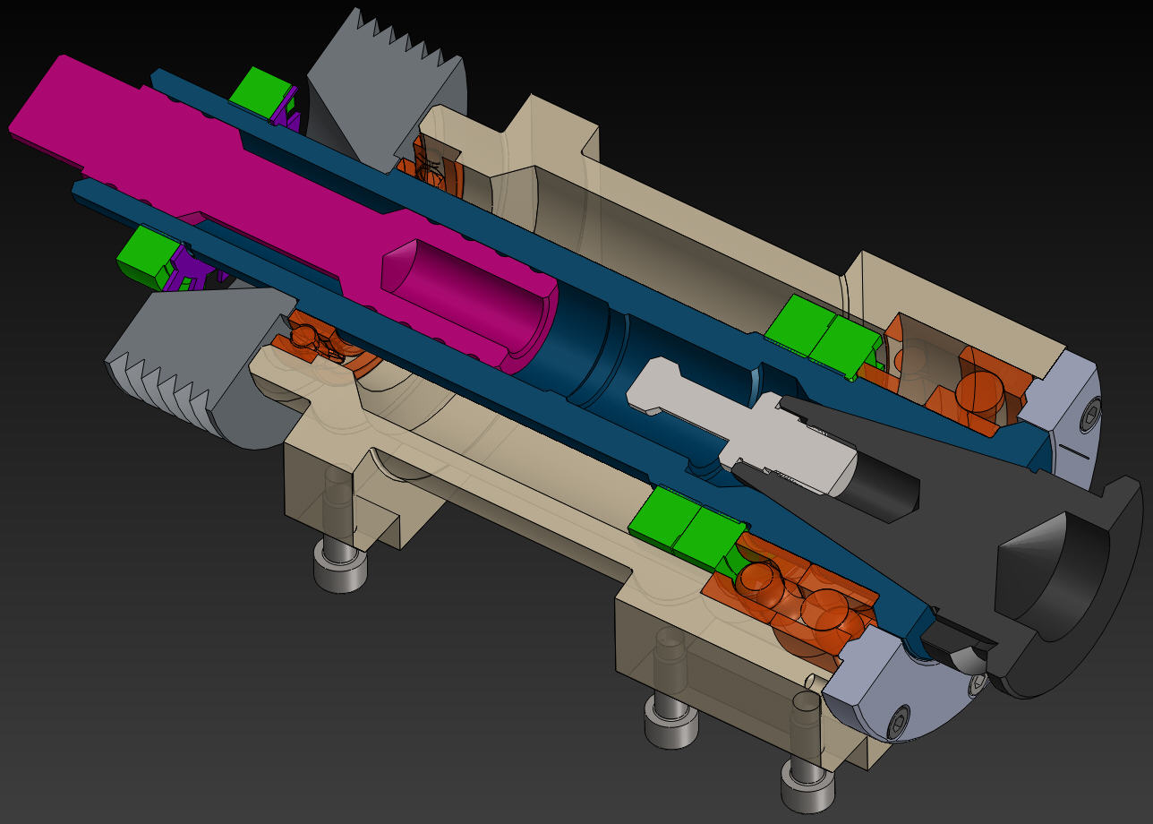 Možná pomůže fotka - jsou na ní cartridge do tříosky, ta horní je dead, ale to není důležité. Takže - zleva - to černé s půlkruhovým vykrojením je uvolňovací tyč nástroje, na ni působí pneupíst, opírá se však o vnitřek, to vykrojení slouží pro indukční snímání toček. Dále napravo je vidět matice, která stahuje celý systém talířových pružin, napravo od ní je vidět právě ten záchyt axiálních sil (je černý) o něj se opíra píst při výměně. Pak je vidět dvojice harních ložisek, to dírkované vedle nich je kroužek pro vyvažování. Dále napravo je pak těleso rotoru, vedle něj dolní vyvažovací kroužek. A pak už je jen uložení spodního ložiska. K tomu unašeči - jen malé upozornění, při jejich použití je třeba mít vřeteno s enkodérem - lidově řečeno aby vědělo, jak je natočené, protože jinak nemá šanci trefit unašeč.