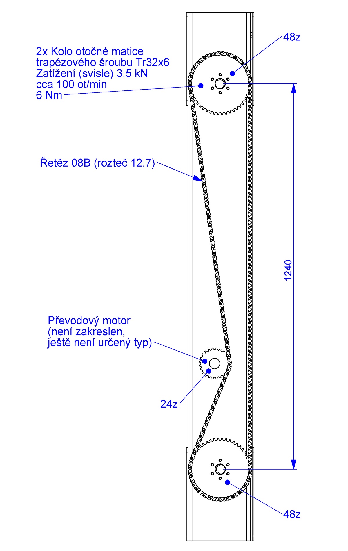 Mám dva trapézové šrouby, které by se měly synchronně otáčet. Napadlo mě spojit je řetězem, první naivní návrh přikládám. Nenašel by se prosím někdo, kdo má s řetězy zkušenosti? Já to řeším poprvé a nerad bych udělal chybu :-) Tuším například, že úhel opásání hnacího kola asi nebude stačit, ale určitě tam bude ještě něco.