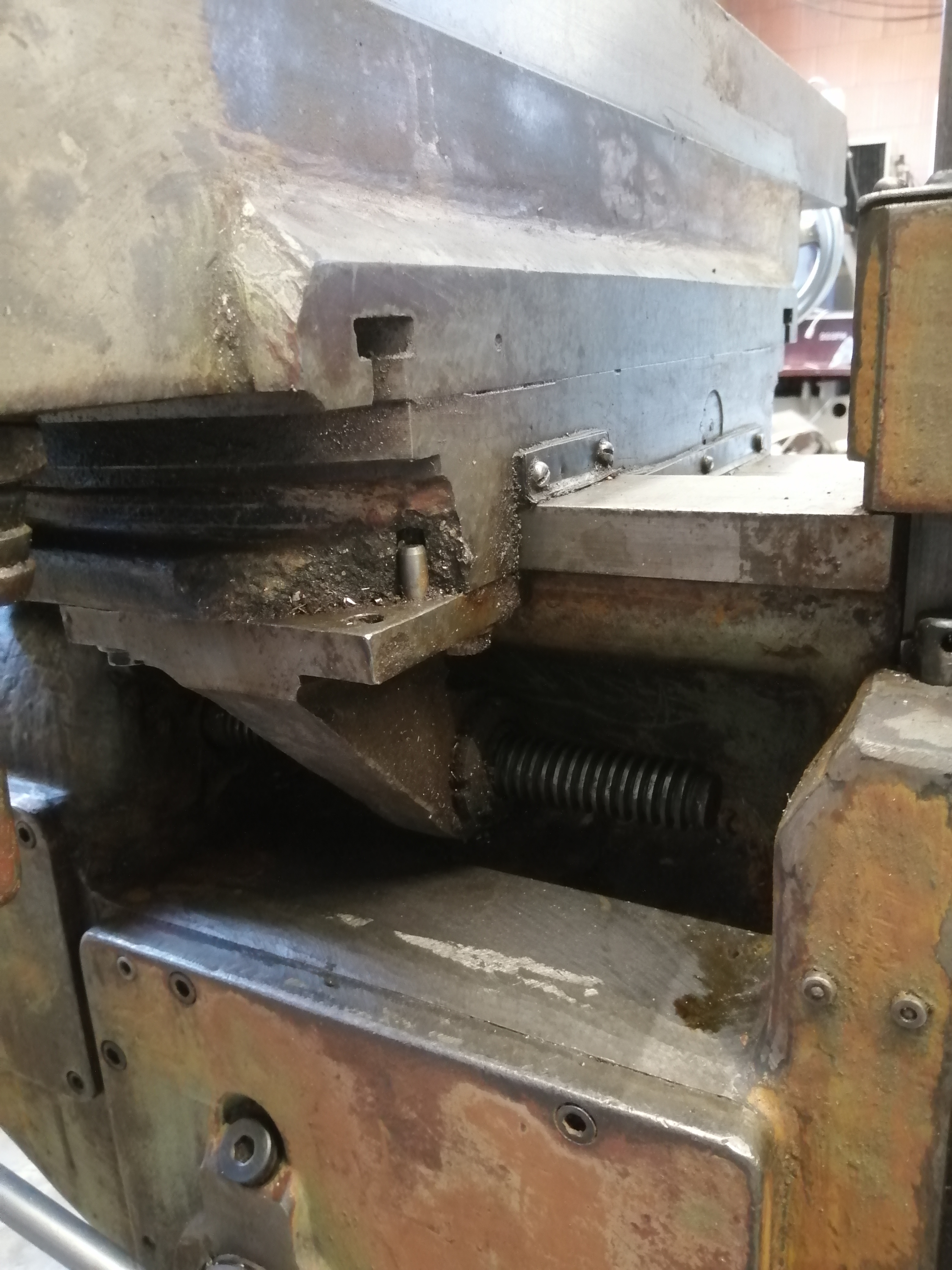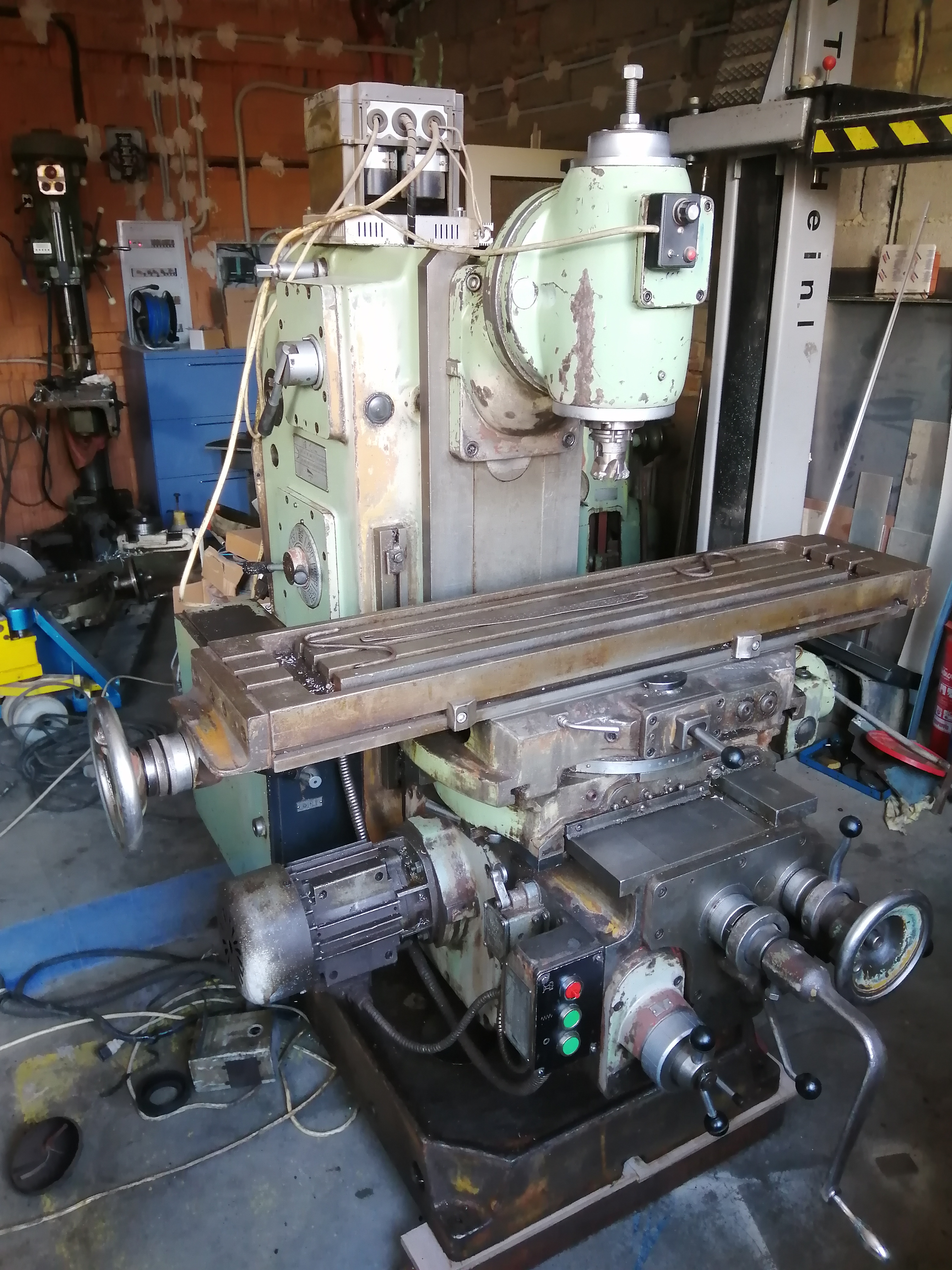 Tu jsem vzal, že na ni předělám hlavu z 6p81, protože má větší stůl a spřažené pohony. K tomu však také nedošlo. Víc o ní nevím, neměla motor. pohon vřetena se točí lehce, řazení posuvů jde také lehce. Opěrné ložiska nemá. Má povrchovou rez, i přes to že byla namazaná. Stojí sice venku, ale je celou dobu pod střechou. Čekala až se dostane do dílny, ale místo ní šlo postarší centrum MCV32, tak už na ni není místo.