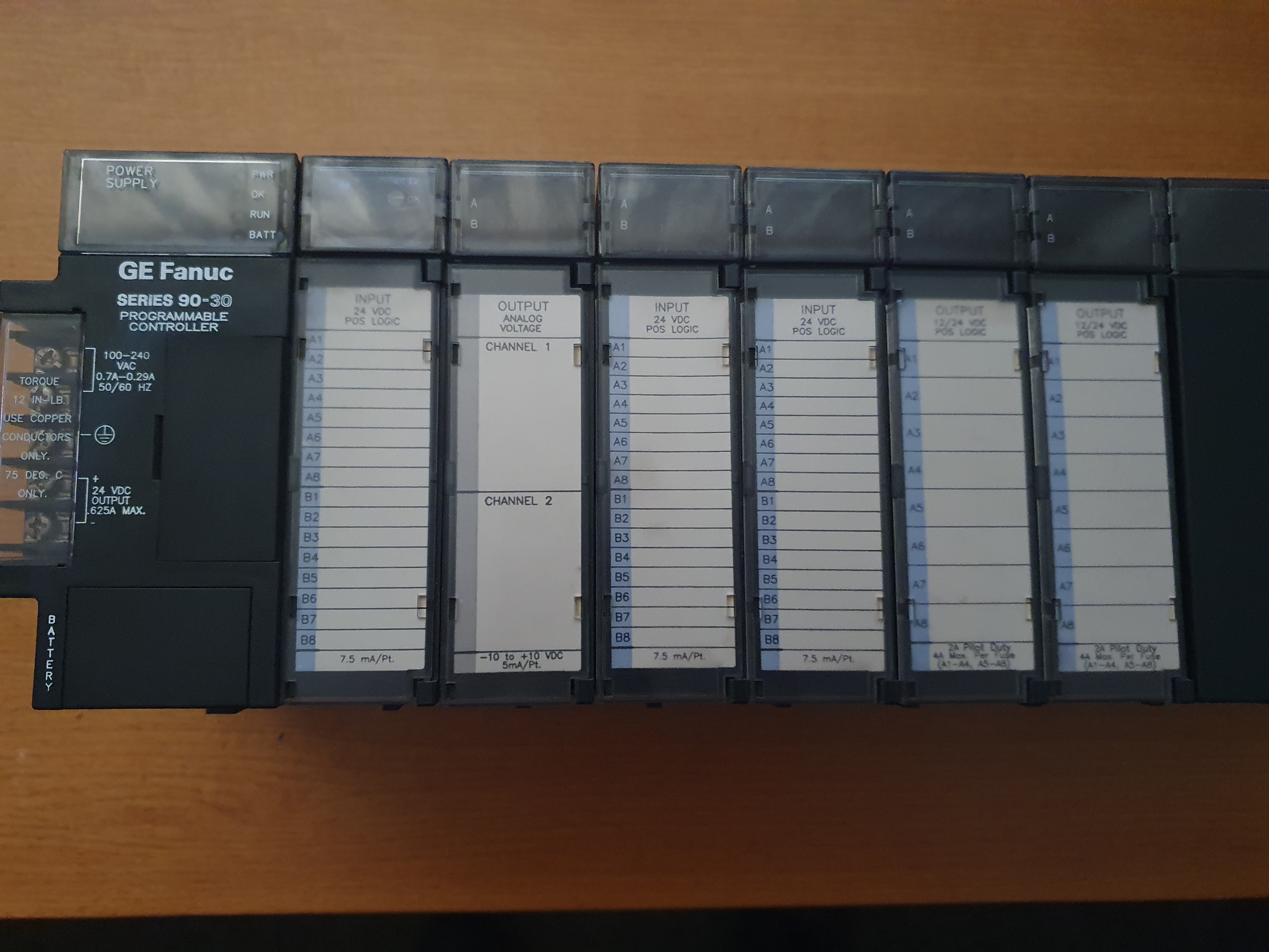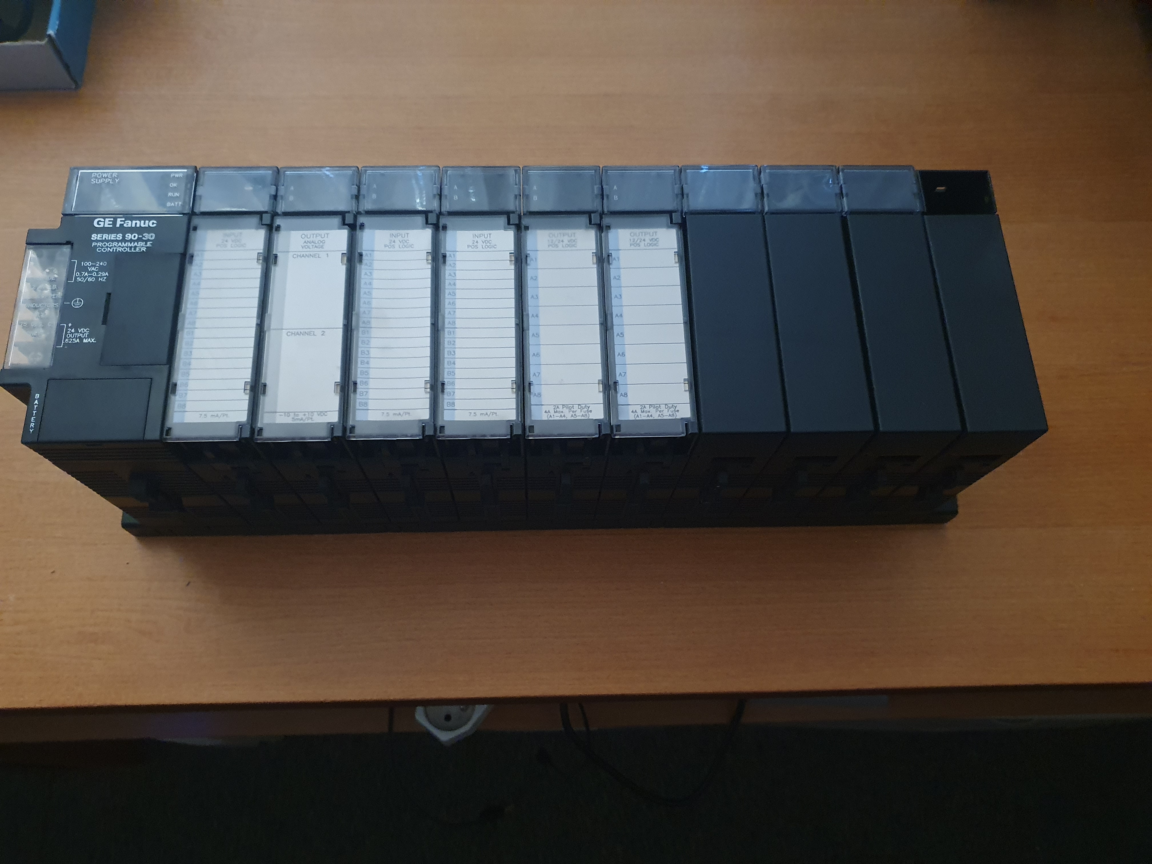 dostala se mi do ruky nejspíše nikdy nepoužitá skladová sestava PLC, dle kolegy byla jako záložní ke stroji. Možná v ní je program, možná ne, nemám programovací kabel. Sestava je deseti modulová plus CPU/zdroj, na konci 4 záslepy. Moduly jsou osazeny viz fotka