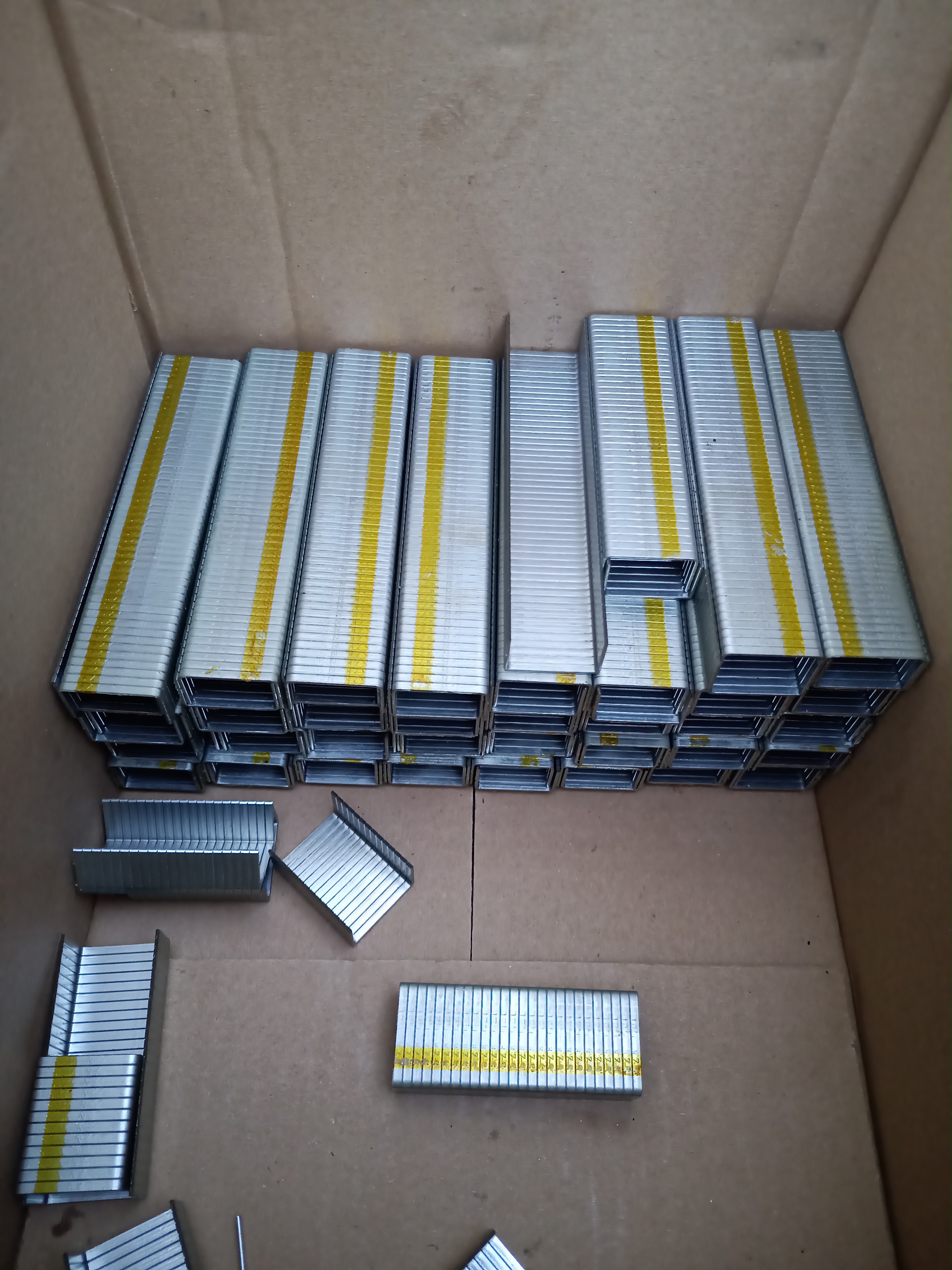 Zdravim mam 65ks bloku po cca. 60 kusech spon 24,4x15mmx15, tl materialu 1mm. Pak nastrelovaci hreby cca. 4x23 mm na dratku 7 bloku po 100ks typ 3071 a 5 bkoku po 100ks 3072.