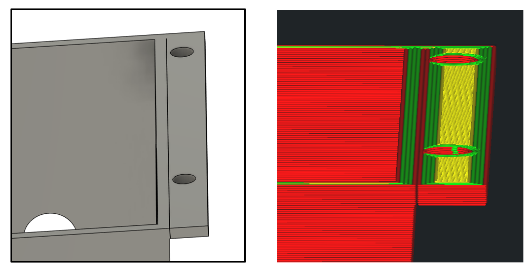 Tie prevísajúce boky by sa dali spraviť tak, že by mali uhol 50-60° a vovnútri by boli zapustené otvory na skrutky, aspoň z tej jednej strany kde to ničomu nevadí. Je to omnoho pevnejšie a netreba pri tlači podpery. A na spodok tých dištančných stĺpikov by som určite pridal poriadne rádiusy.