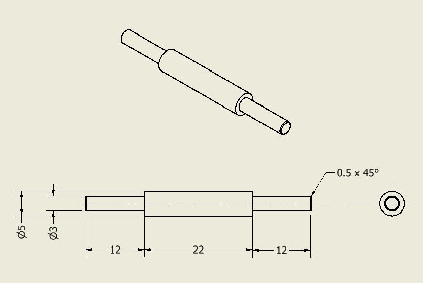 (Střední část může zůstat neobrobená. Oba konce mají d3mm. Sražení (oboustranné) není nutné, lze dodělat až při montáži - pokud by to byl problém.)