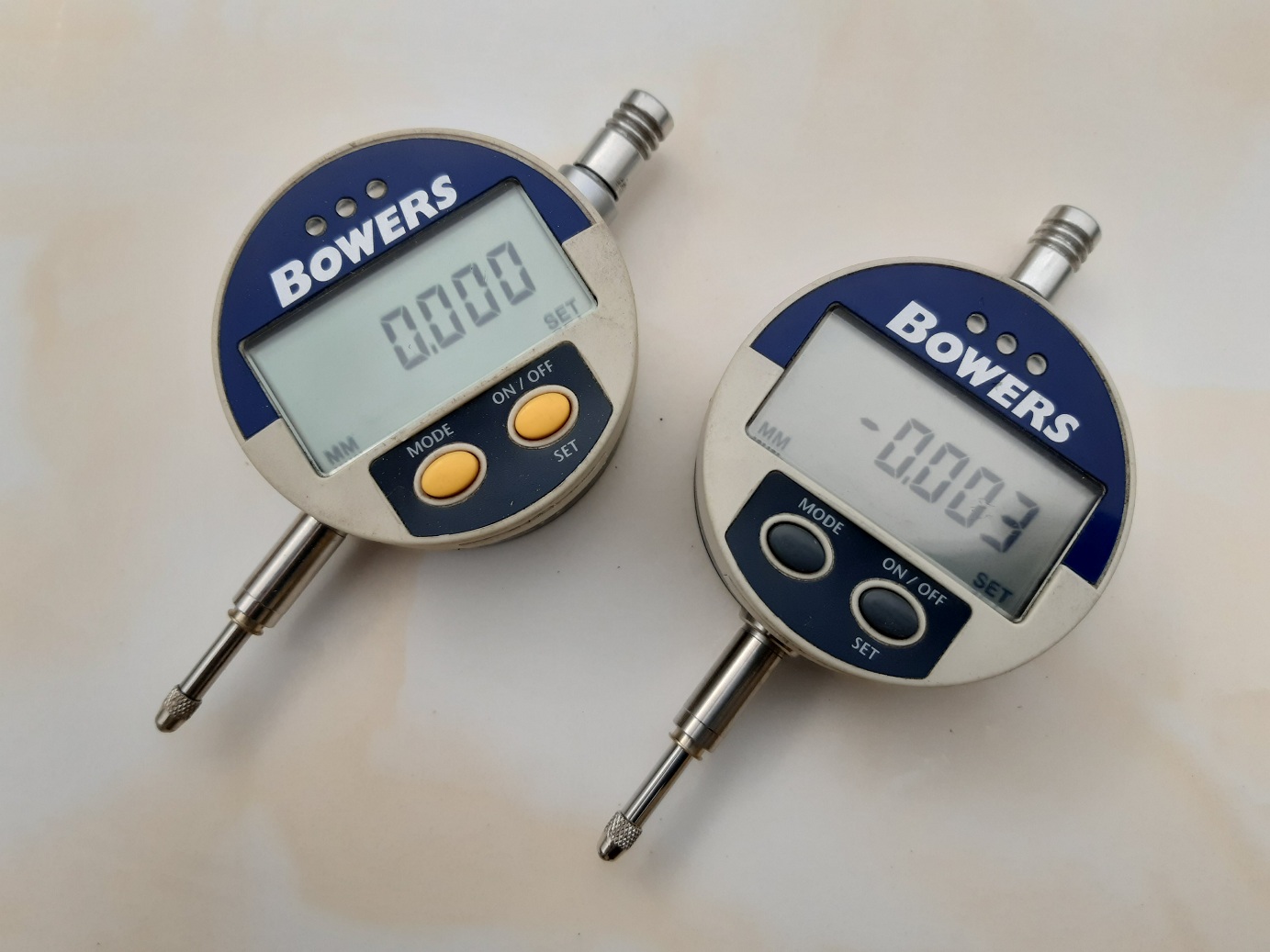 Číselníkový úchylkoměr Bowers (Sylvac) s rozsahem 13mm a krokem 0,001. Použité, vizuálně v dobrém stavu, chodí dobře, aktuálně nekalibrováno. Displej se dá otočit o 3/4 otáčky. Má to spoustu funkcí, někde najdu možná i návod v angličtině. K dispozici 4 kusy, dva se žlutými a dva s šedými tlačítky, jinak jsou myslím stejné.